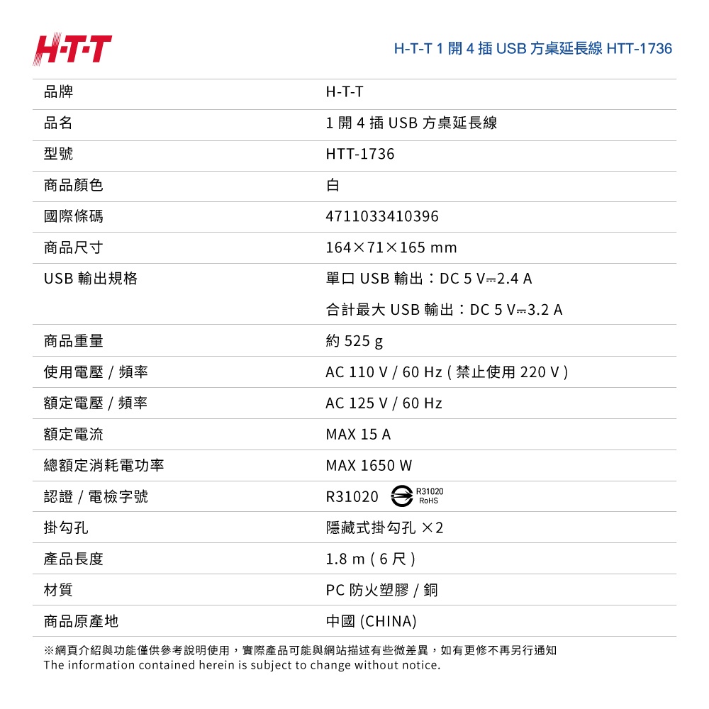 H-T-T 1開4插3USB方型 6尺 延長線 HTT-1736
