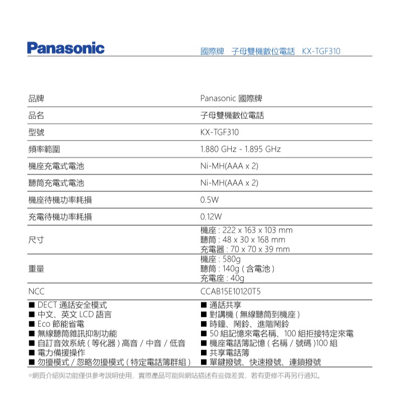 Panasonic 國際牌 子母雙機數位電話 KX-TGF310TWM