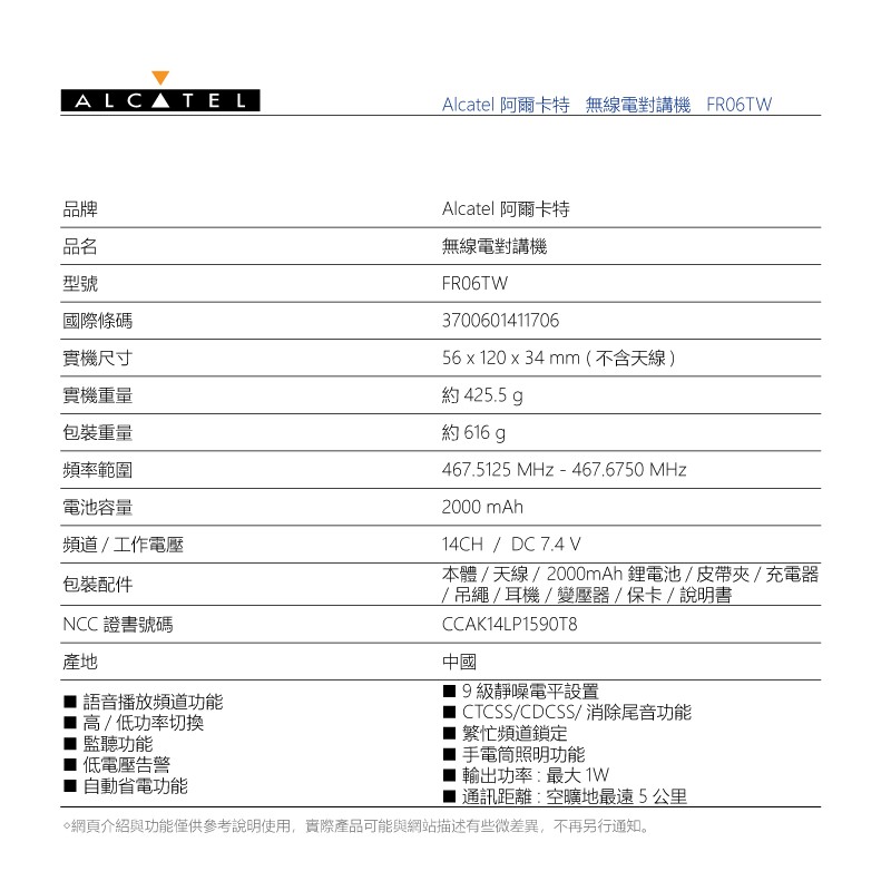 Alcatel 阿爾卡特 無線對講機 FR06TW