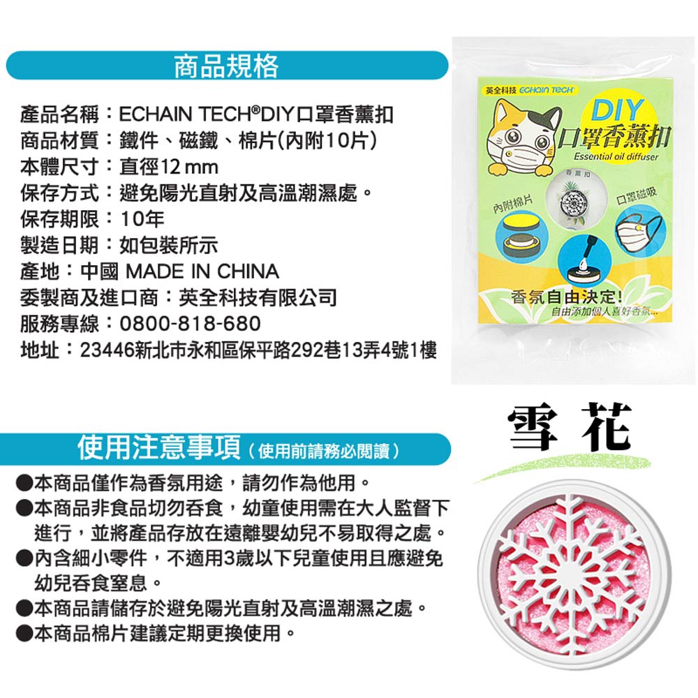 ECHAIN TECH 口罩香氛扣 口罩扣 口罩香薰扣 香氛扣 熏香扣 口罩精油扣 現貨- 雪花(附贈十二個棉芯片)