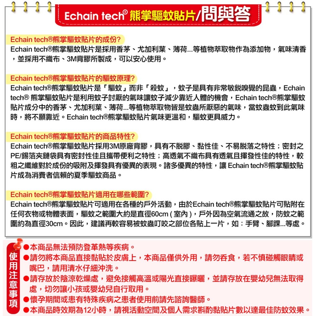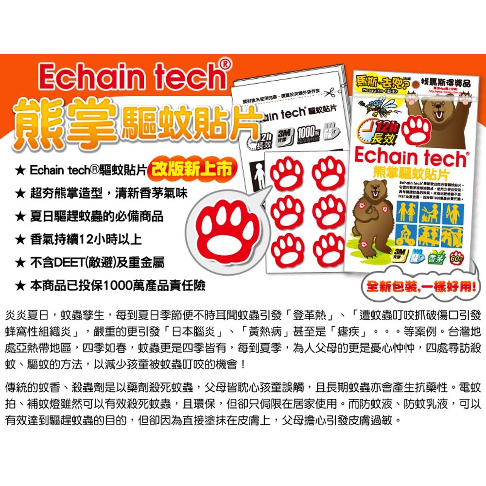 ECHAIN TECH 熊掌驅蚊貼片 熊掌長效驅蚊貼片 熊掌防蚊貼片 -香茅60枚