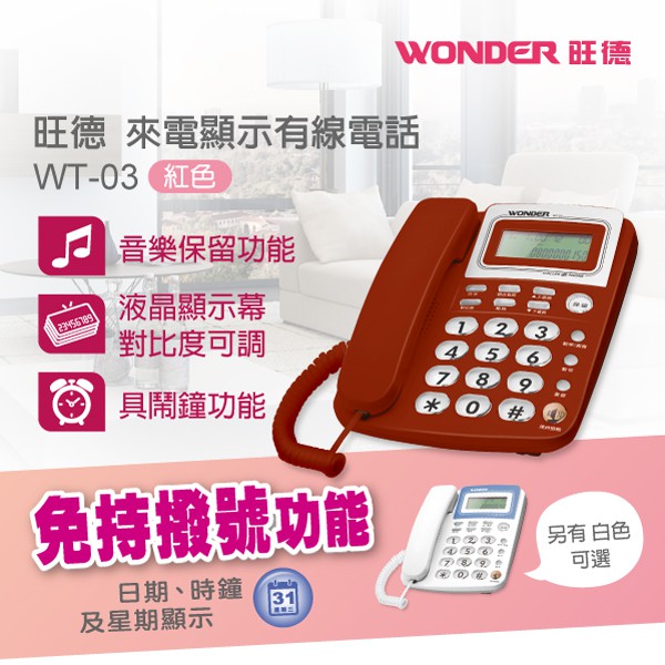 【WONDER旺德】 來電顯示型電話 來電記憶 快速撥號 音樂保留 免持撥號 WT-03