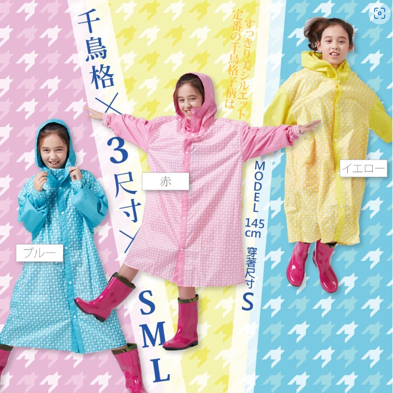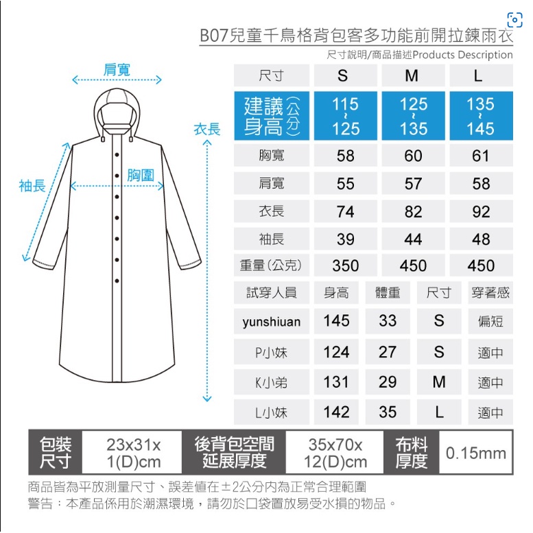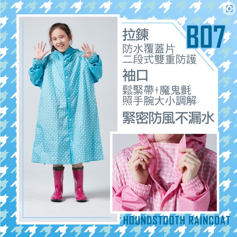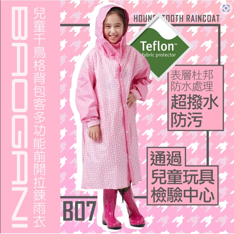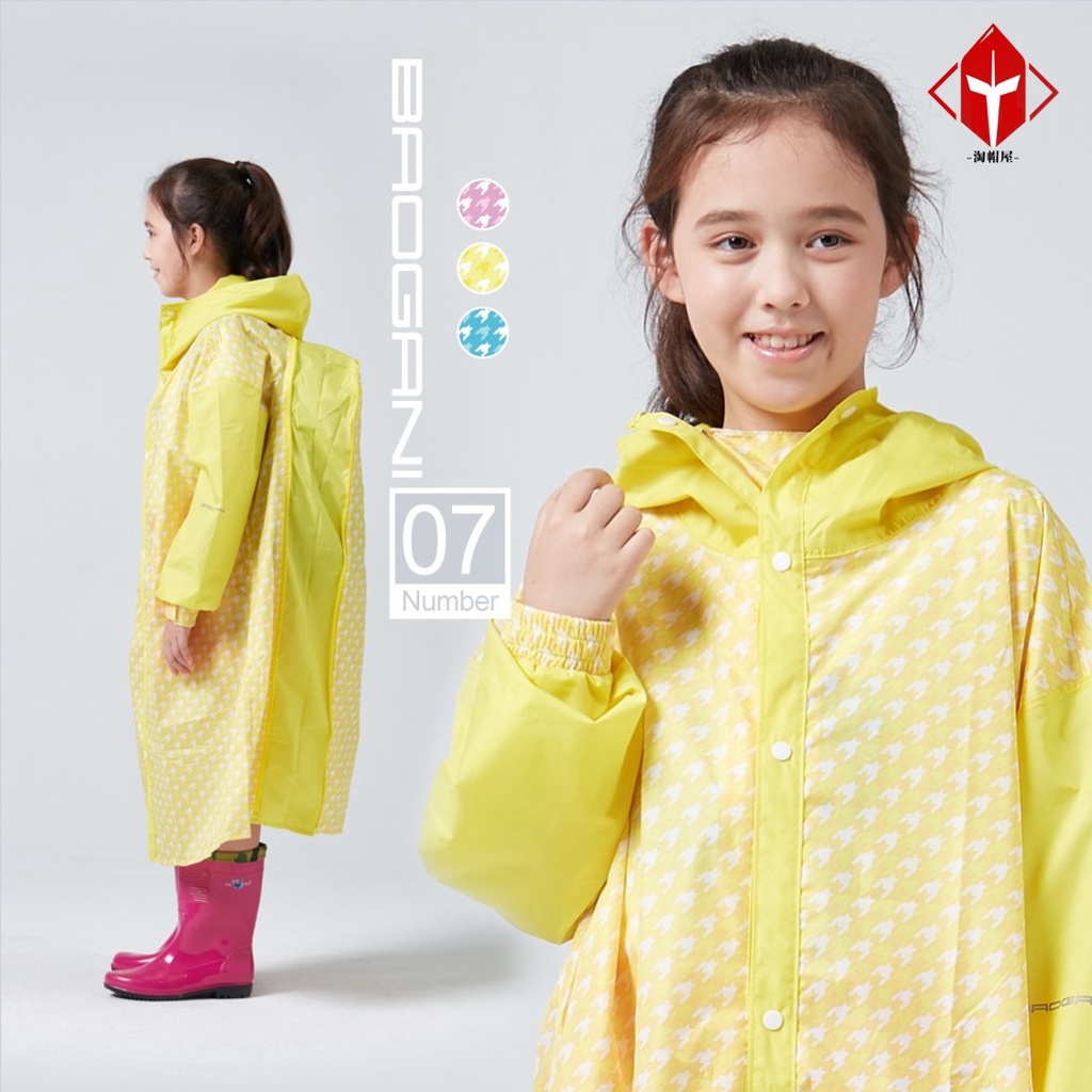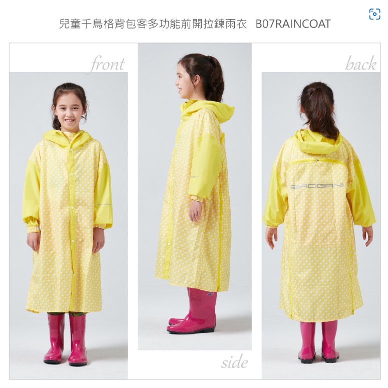 寶嘉尼 BAOGANI B07 兒童千鳥格背包客多功能前開拉鍊雨衣 黃色 一件式雨衣 兒童雨衣 加大 加寬雨衣 背包雨衣