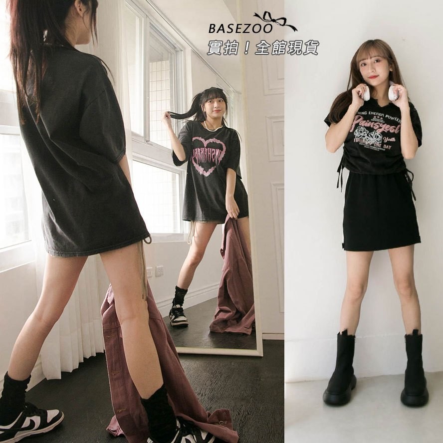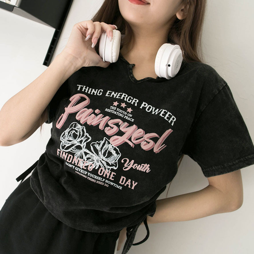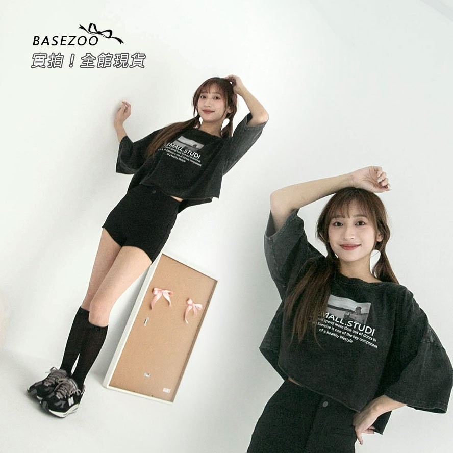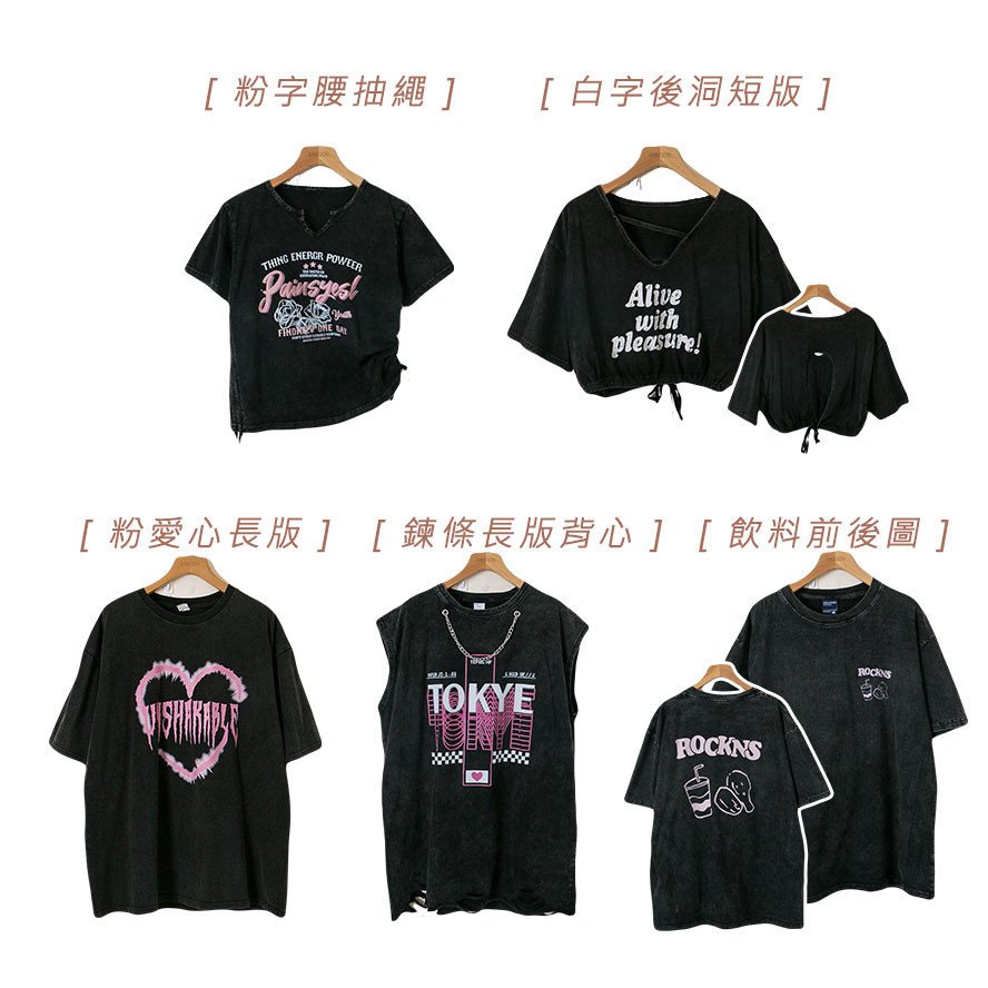【全館現貨】 水洗黑灰印圖 長版棉T背心 短版上衣甜酷系水洗短袖棉T 短版棉T 短版t恤 長版t恤【811201】