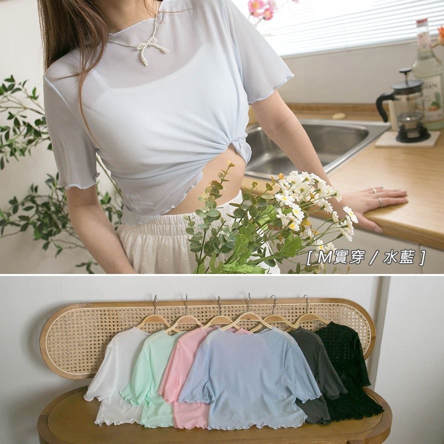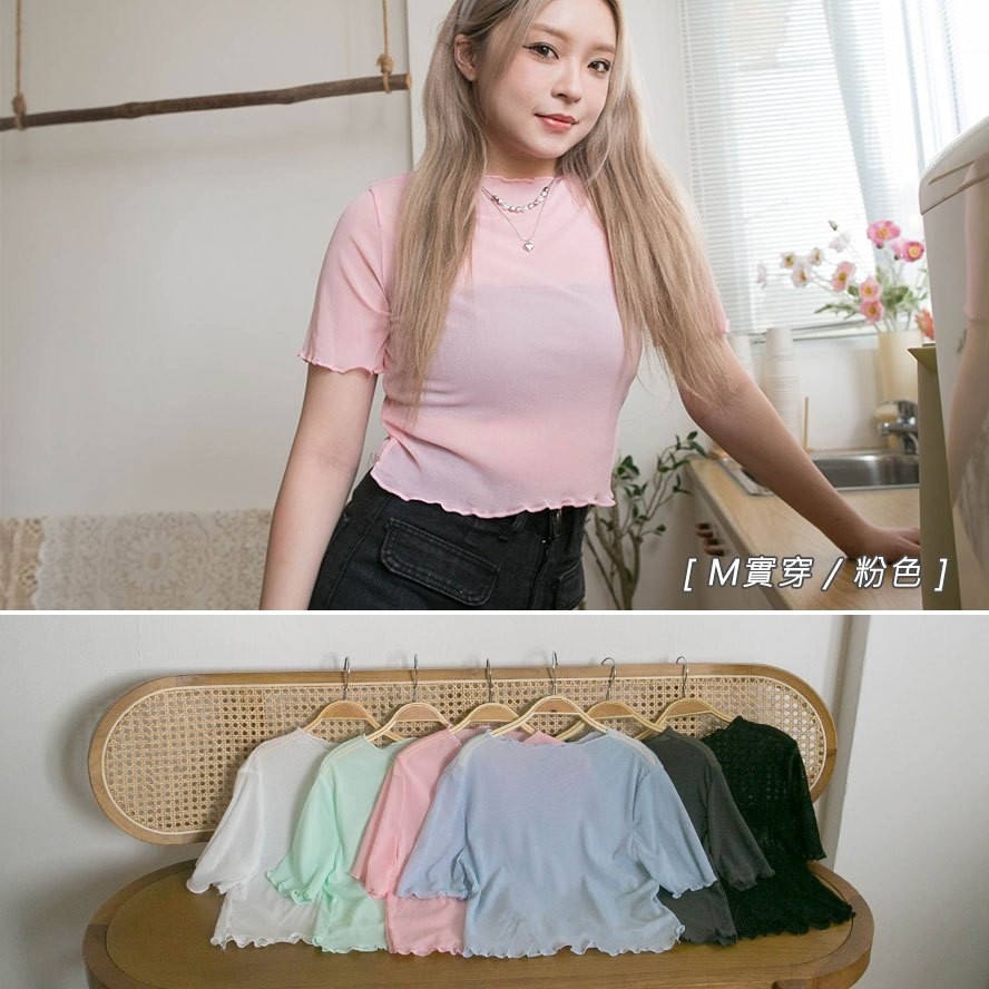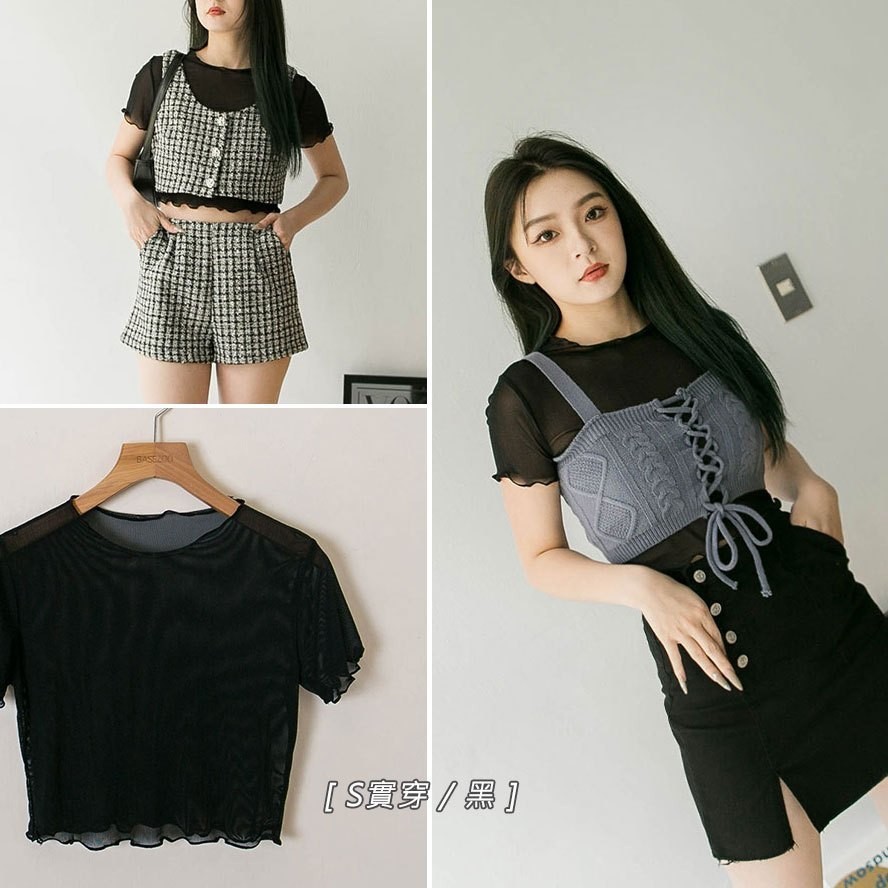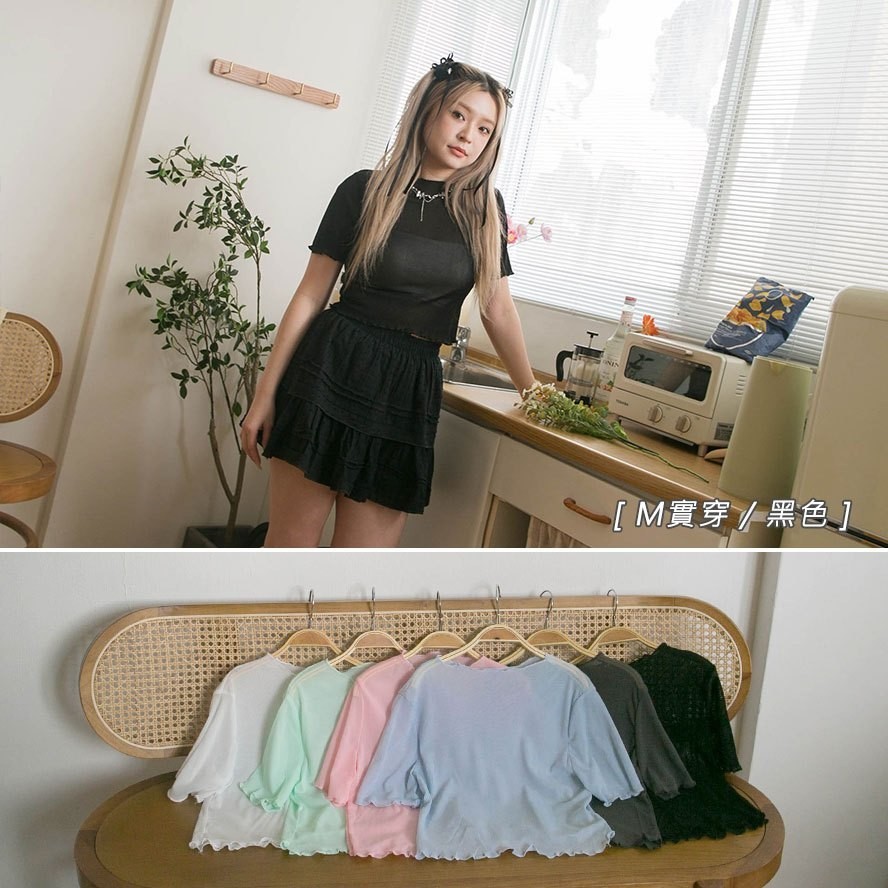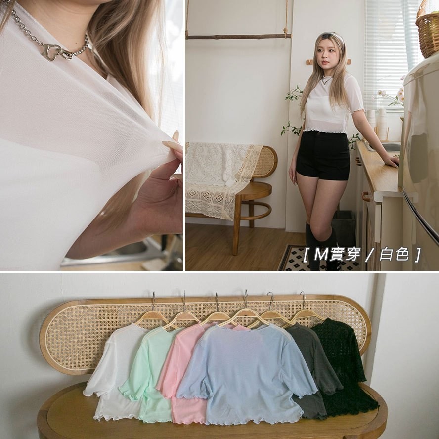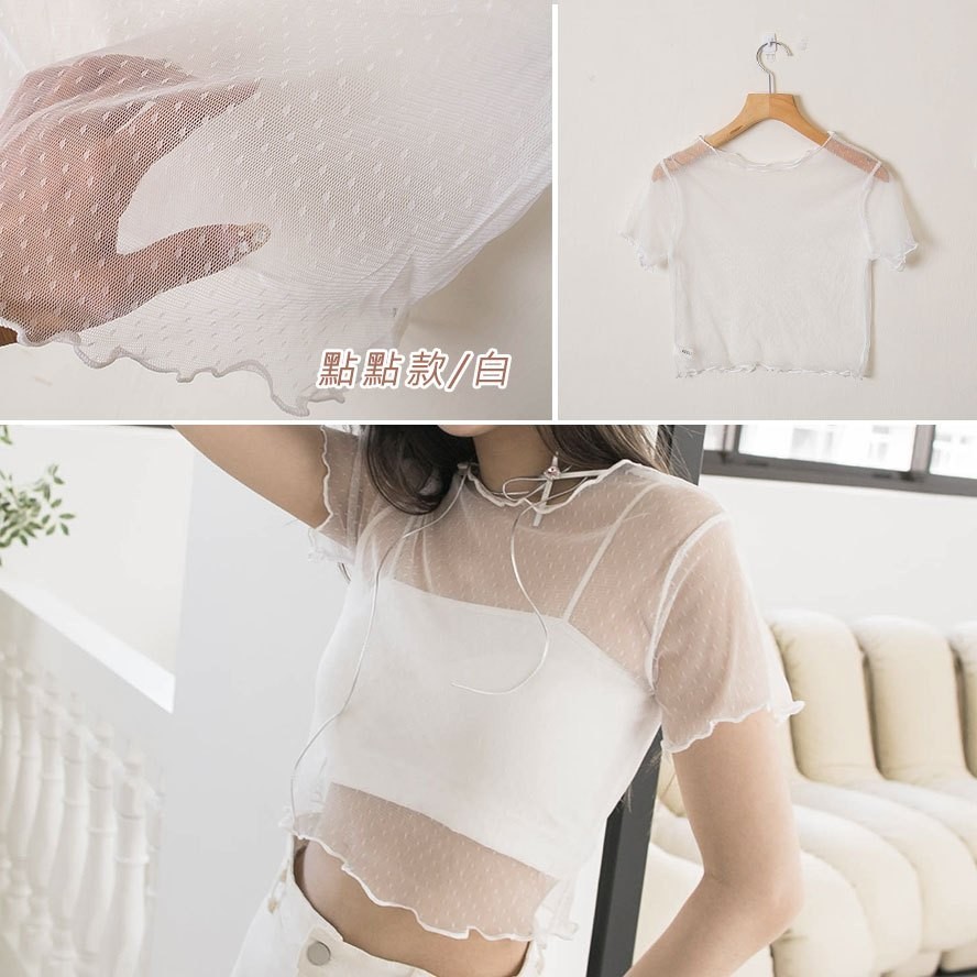 現貨供應 實拍-木耳捲邊 透膚網紗短版上衣【390902】內搭單穿都好看~