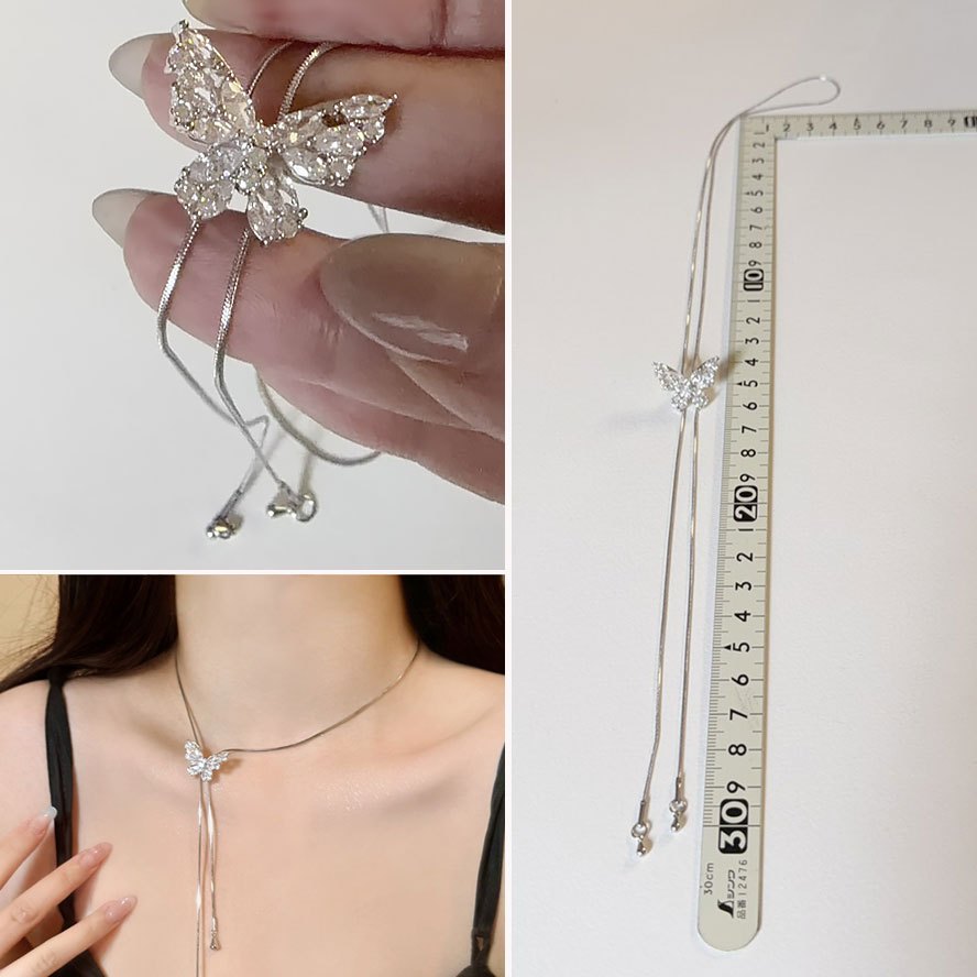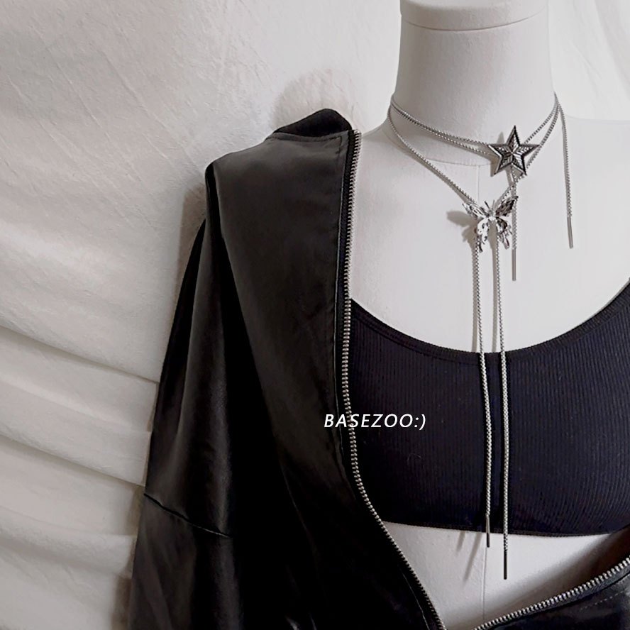 現貨-甜酷個性 蝴蝶 線條皮繩雙層頸鍊 choker 項鍊【958012】銀色長鏈項鍊 可調式項鍊 多種戴法滑扣抽拉頸鏈