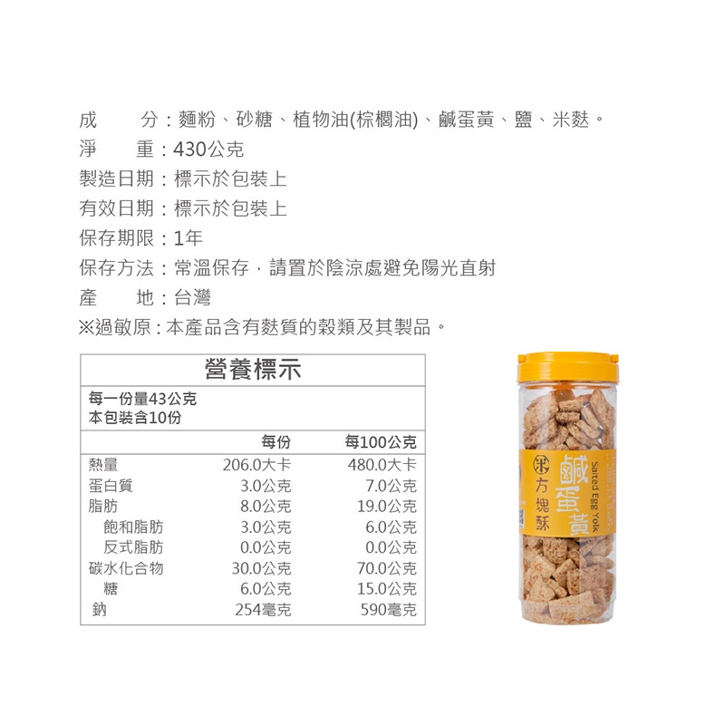 [台灣穀堡]鹹蛋黃米方塊酥 430g (蛋素)現貨,米麩,零嘴,低負擔,米餅乾,(多口味鹹蛋黃/海苔/芝麻/芥末)零食