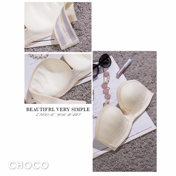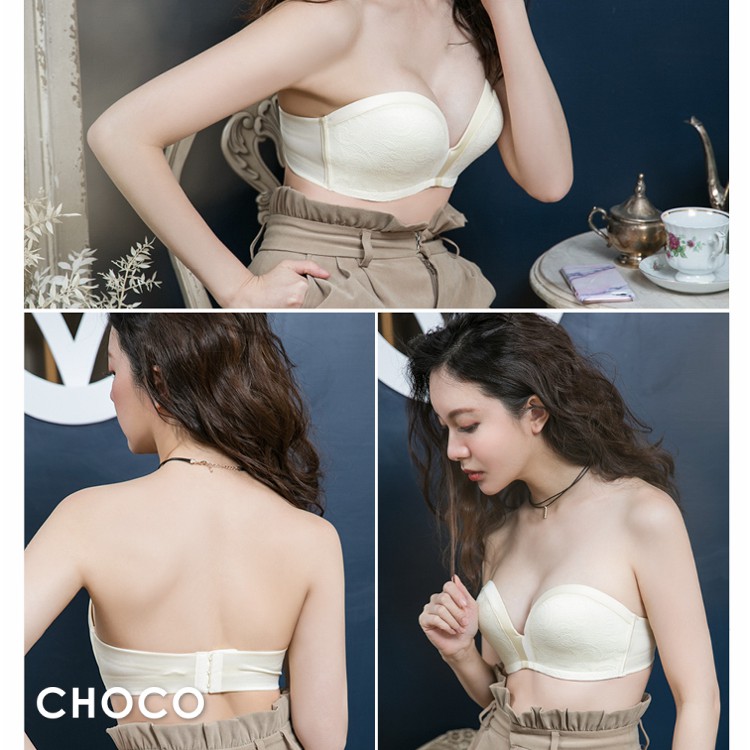 Choco Shop 輕戀漫舞 無肩帶深V緞面包邊蕾絲款(米黃色) 70B-80C