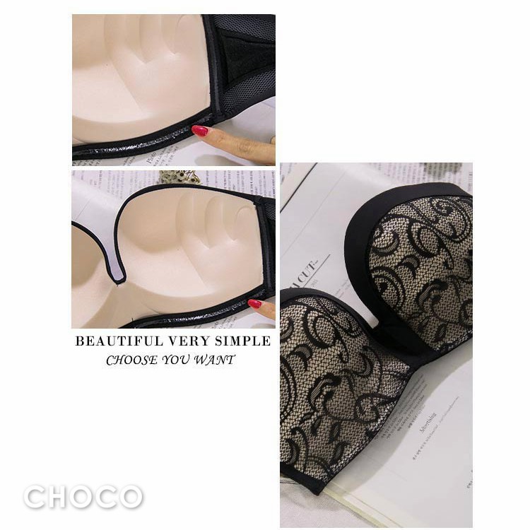 Choco Shop 輕戀漫舞 無肩帶深V緞面包邊蕾絲款(黑色) 70B-80C