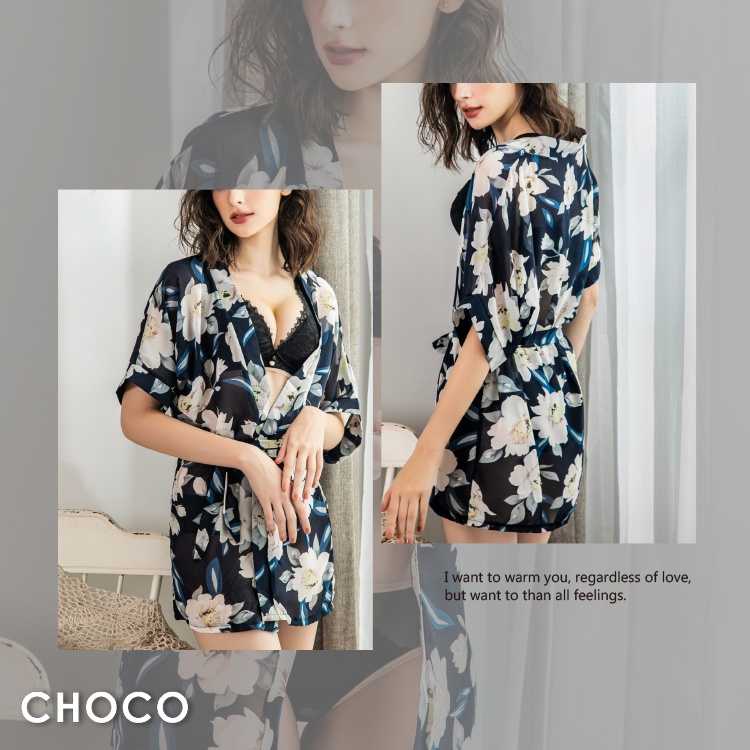 Choco Shop浪漫花塢 春漾印花開襟雪紡紗睡袍(藍色) Free Size
