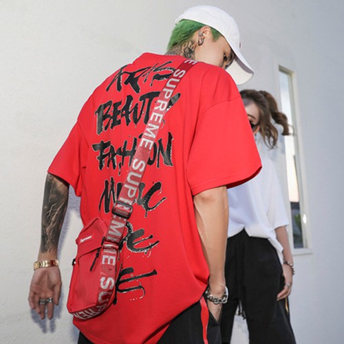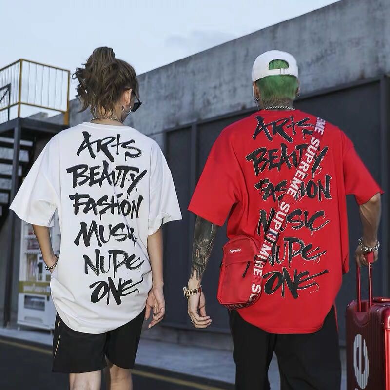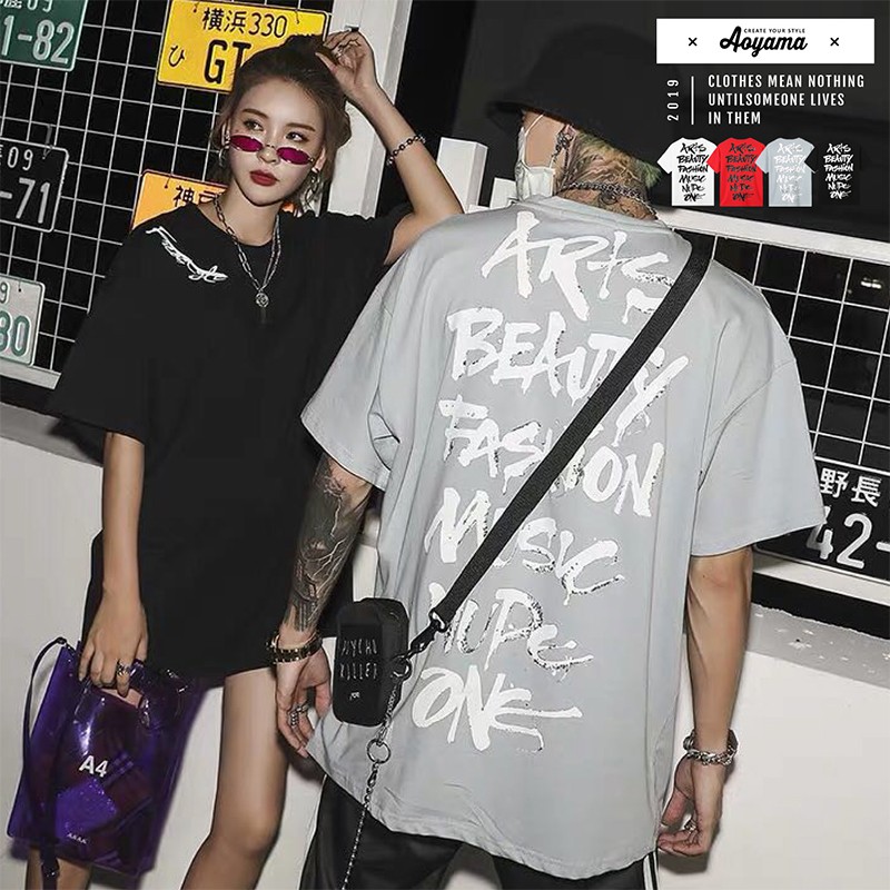 AOYAMA 暗黑系寬鬆落肩塗鴉草寫文字潮流短T【B6802】美式風格 oversize 情侶T 五分袖