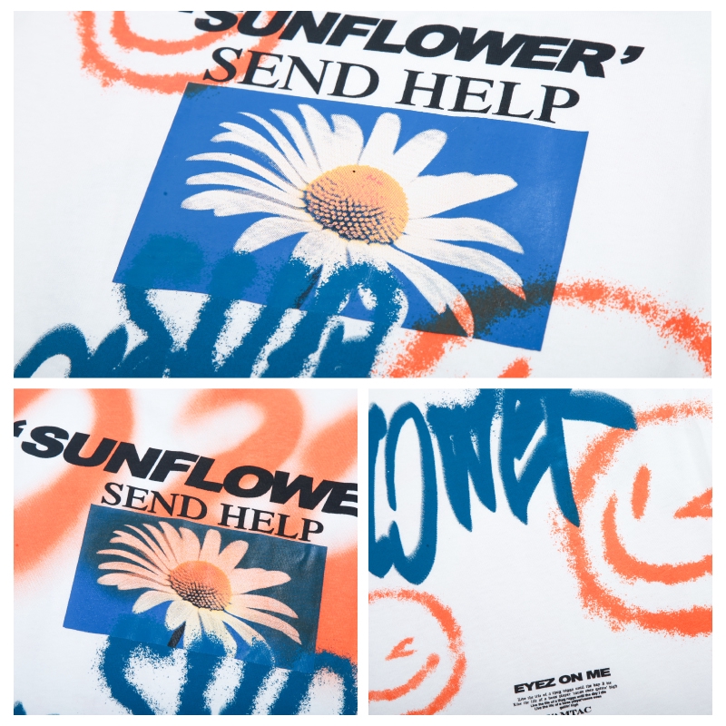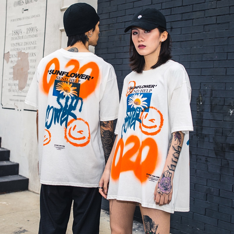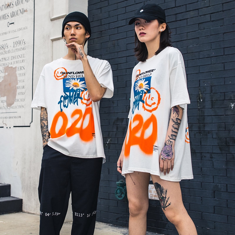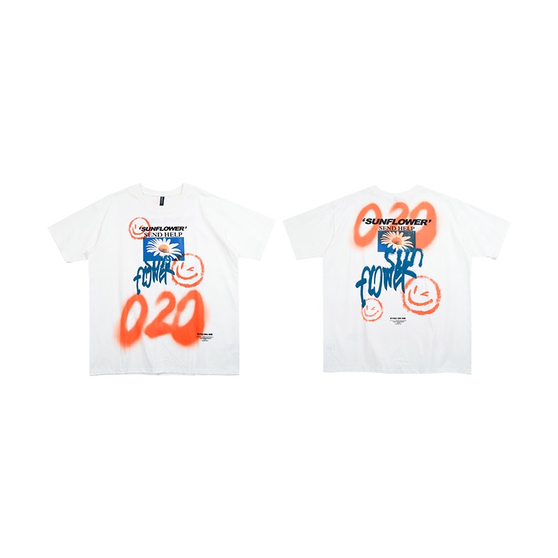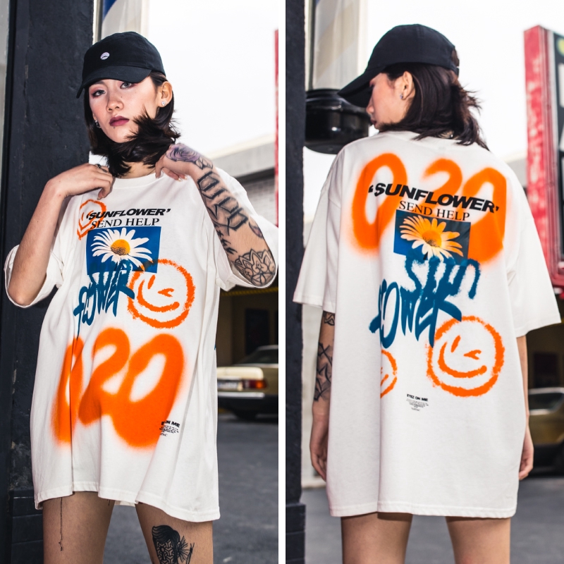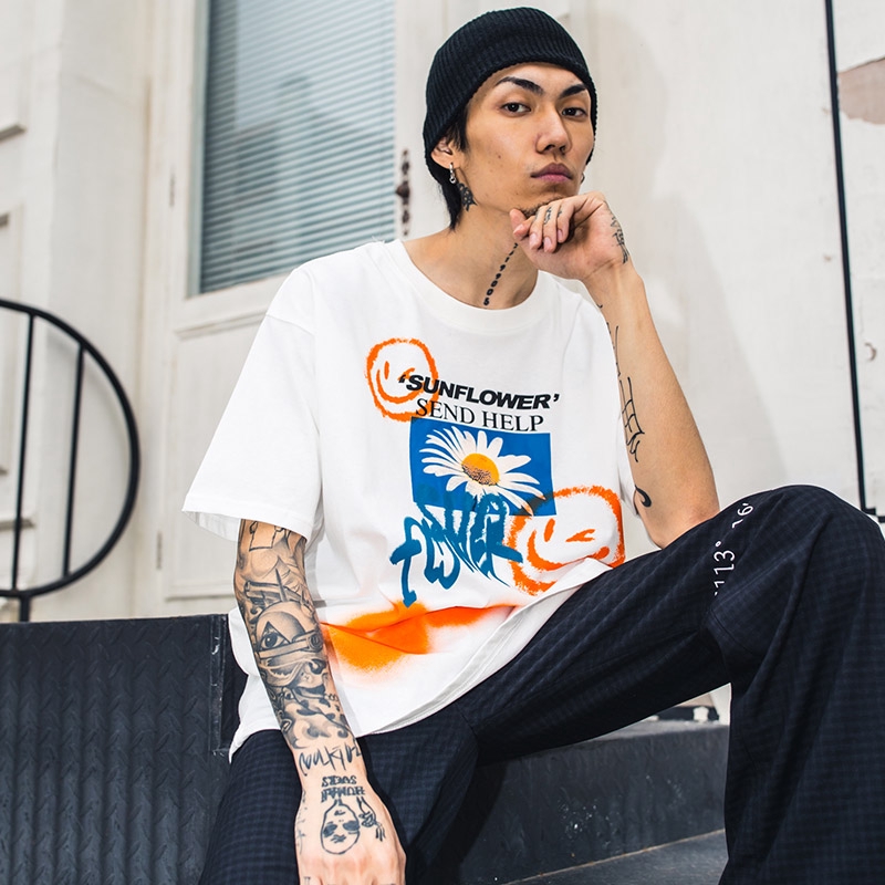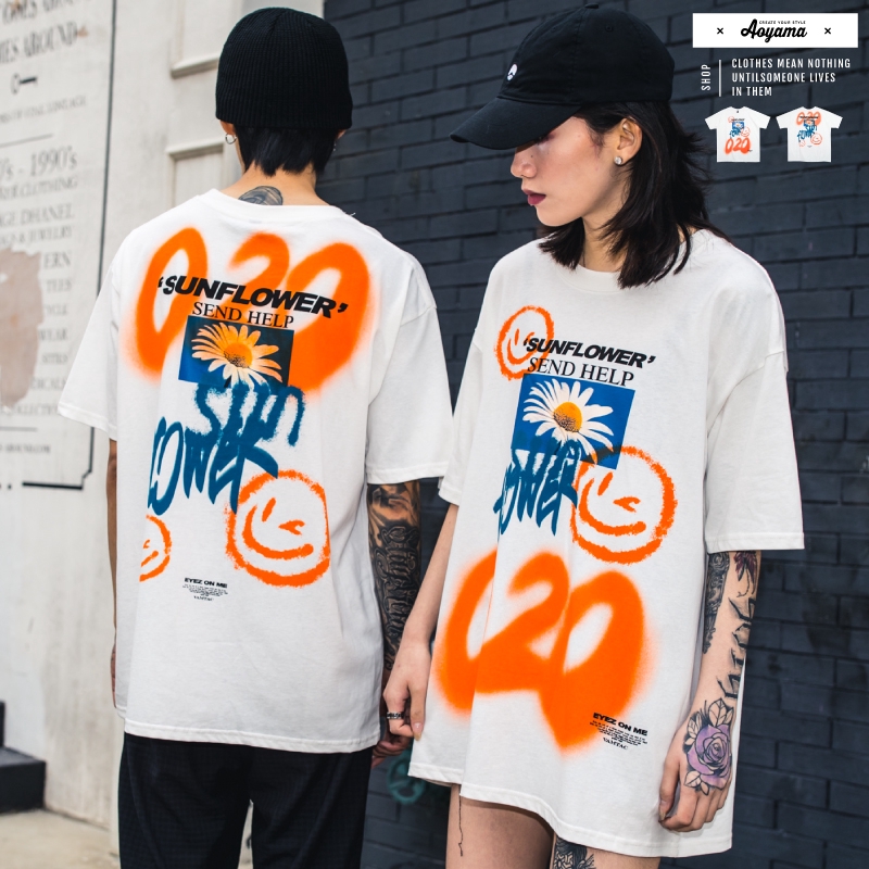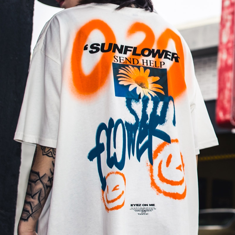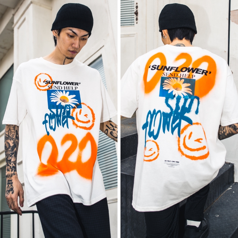 AOYAMA 雛菊噴漆塗鴉 寬鬆落肩短T【VT363】oversize 翻玩 五分袖 嘻哈 落肩 情侶 青山