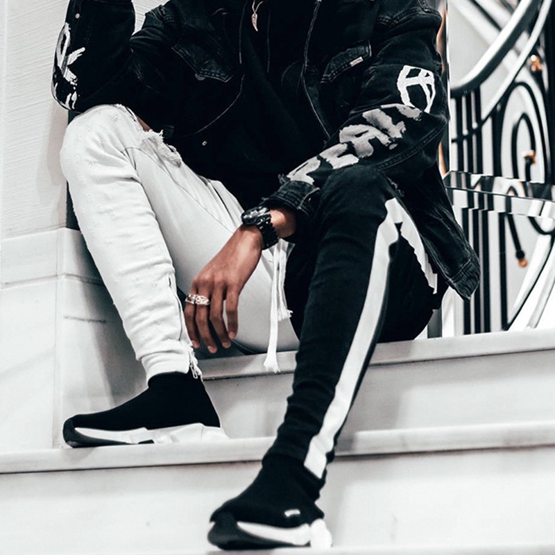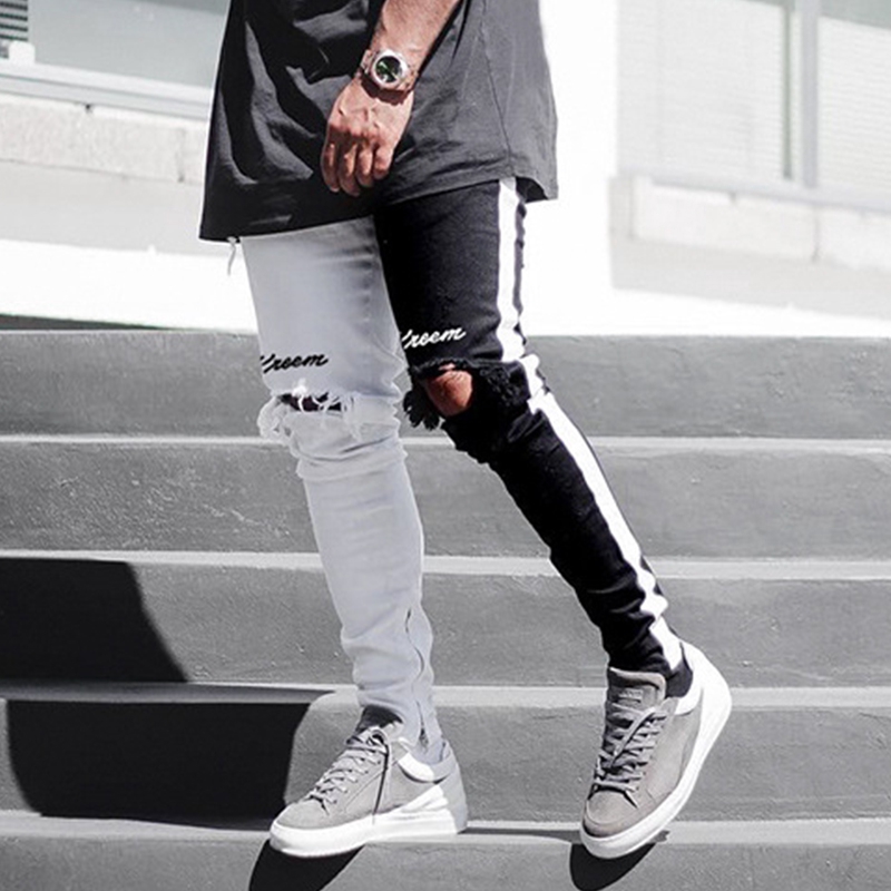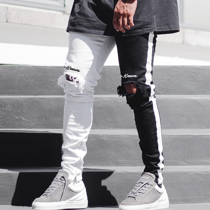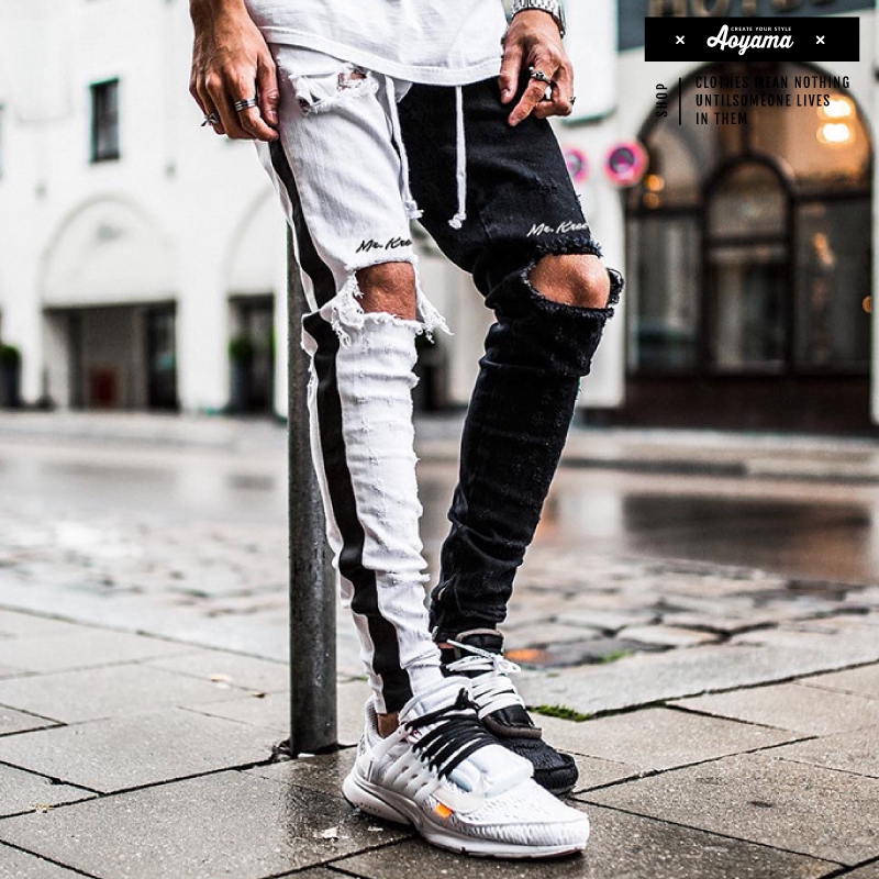 AOYAMA 雙色陰陽邊條 雙膝破壞 美式潮流休閒褲【AK102】工作褲 九分褲 嘻哈 寬褲 潮流 工裝褲 牛仔褲 青山