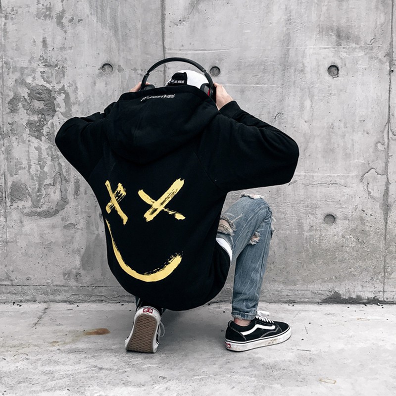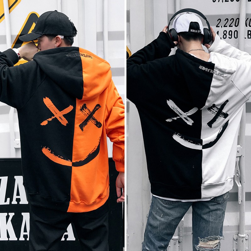 AOYAMA 塗鴉嘻哈笑臉陰陽雙色拼接落肩帽T【B9719】oversize 情侶 帽T 暗黑