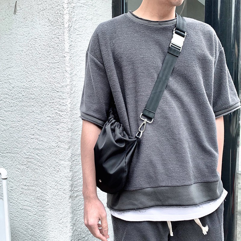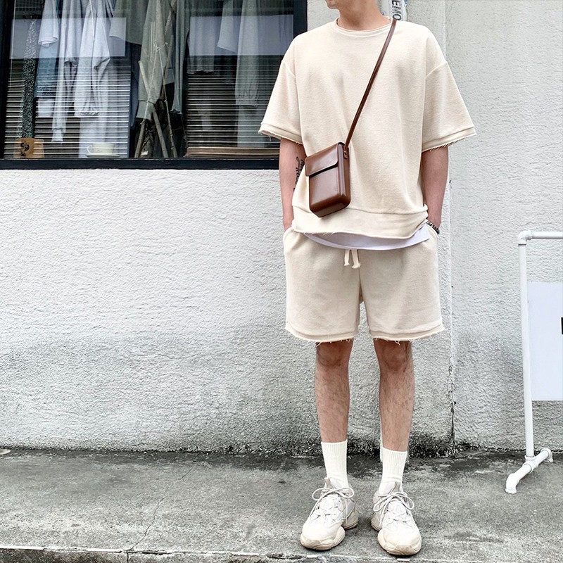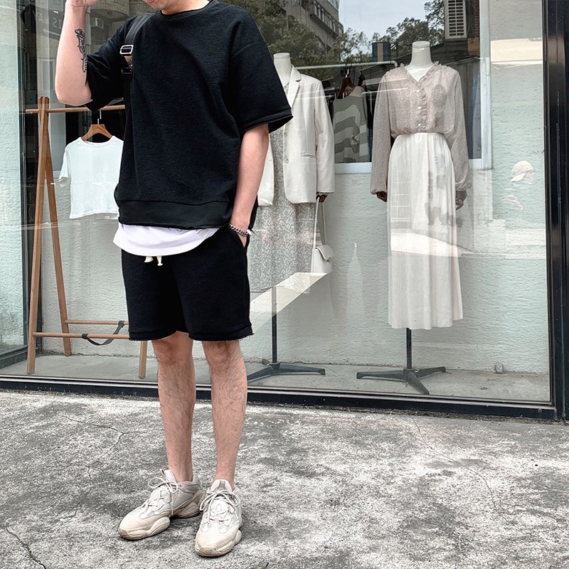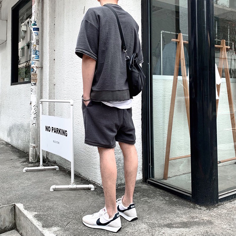 AOYAMA 韓國 厚磅大絨布 不收邊 反面車縫 五分袖落肩短T【C21043】 韓國 情侶 街頭 翻玩 青山 素T
