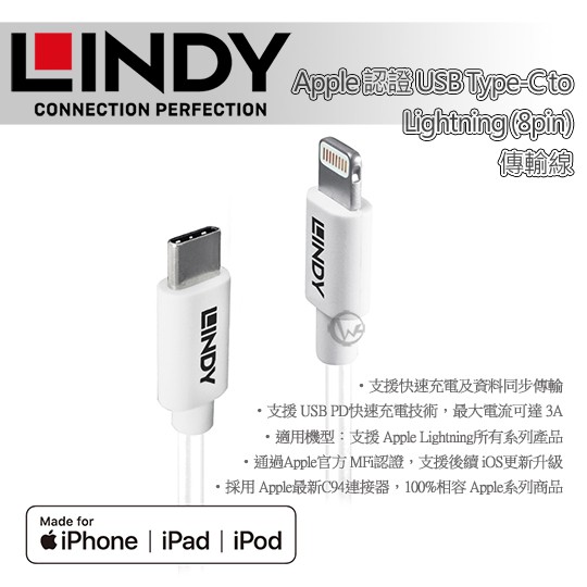 LINDY 林帝 1m-(92027) Apple認證 USB Type-C to Lightning 傳輸線