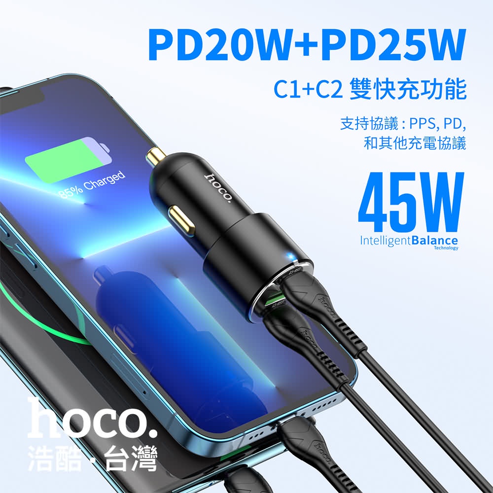 hoco. 浩酷 NZ6 蘭克 PD45W 三口 車載充電器 (車充/快充/三孔/Type-C/USB/黑色)