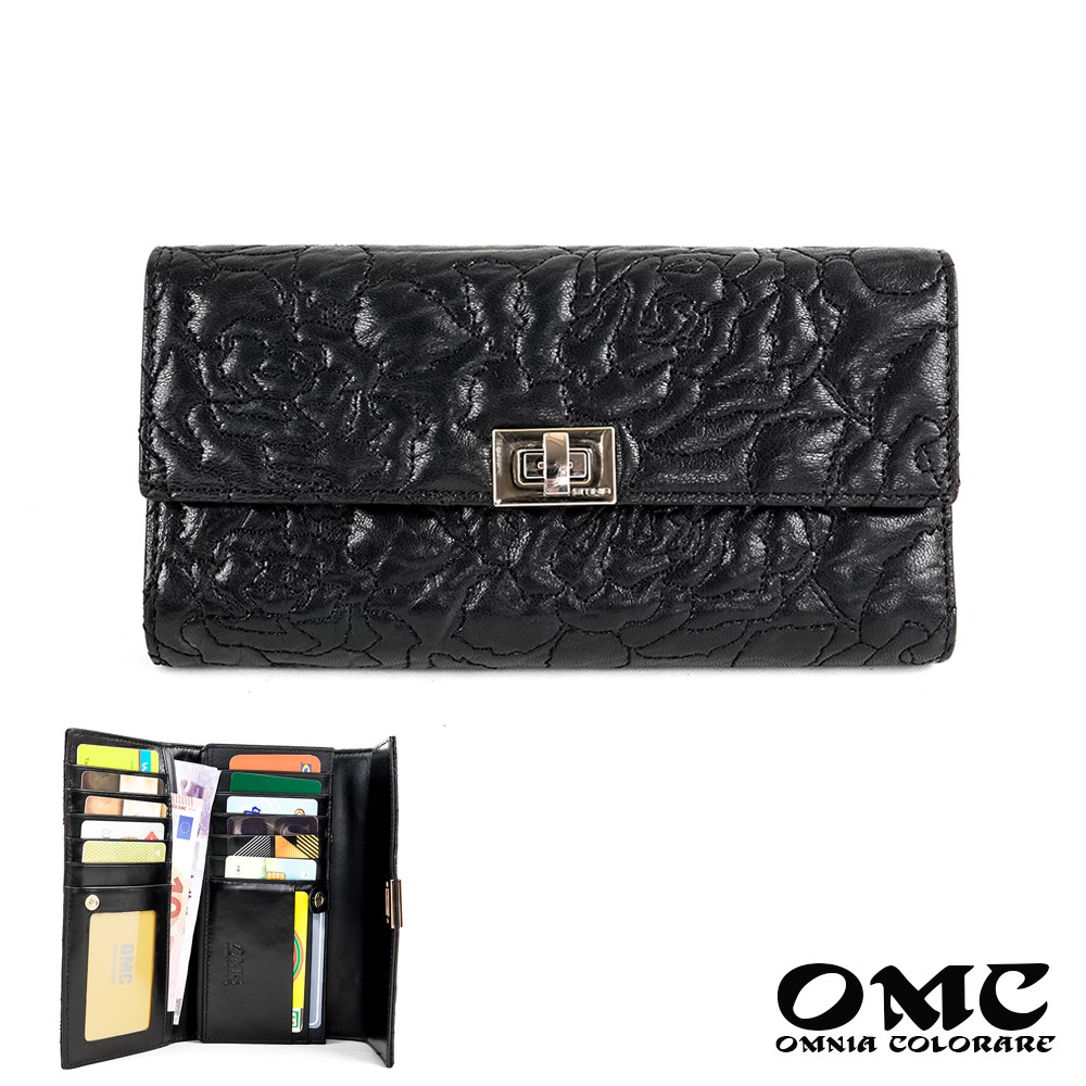 【OMC】13卡1照玫瑰針織轉扣牛皮長夾-黑色