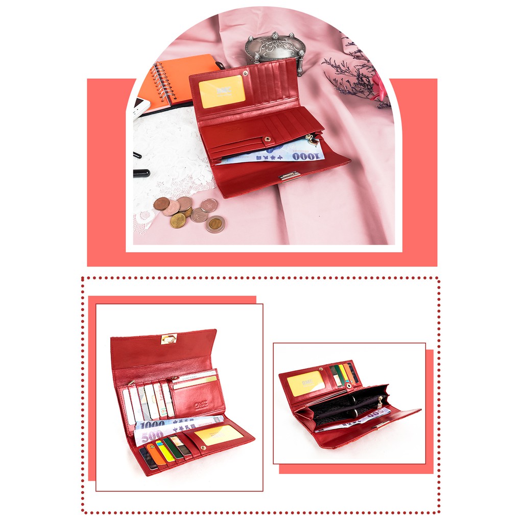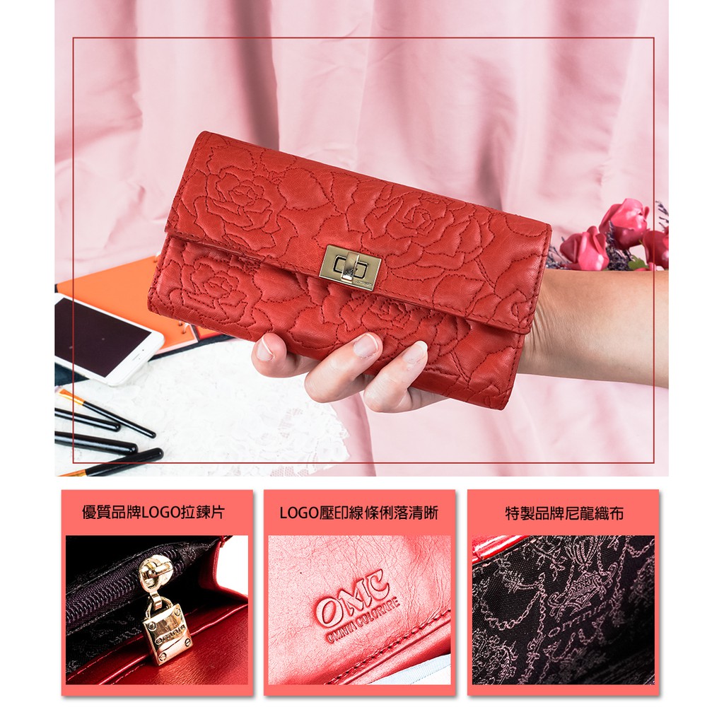 【OMC】13卡1照玫瑰針織轉扣牛皮長夾-橘紅