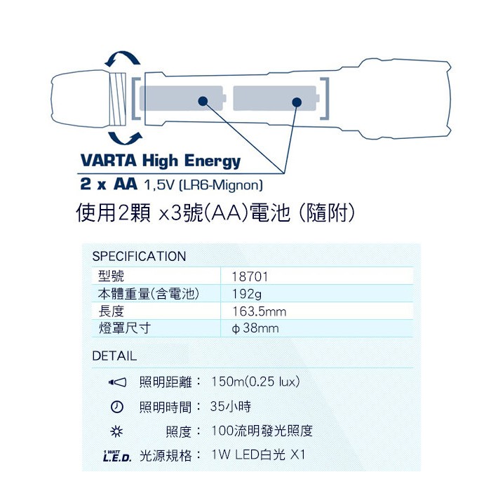 VARTA德國華達 全防護專業型 1W 強光LED手電筒18701