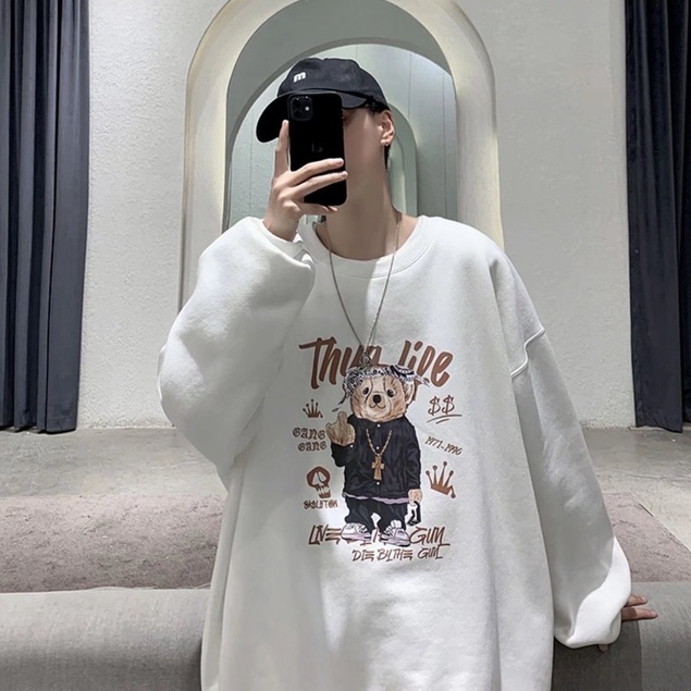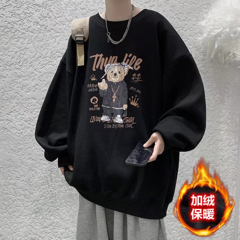 小熊刷毛印花圓領套頭大學T 情侶裝流行刷毛款男潮版港風修身中青年 大學T 印花T 長T(XHD215)【壹號站】