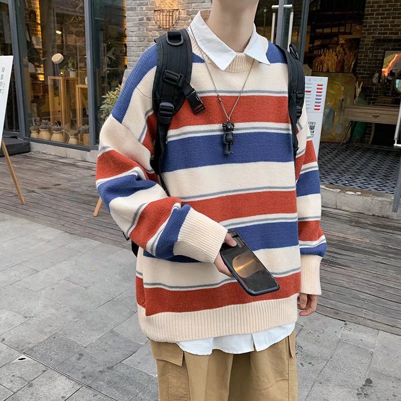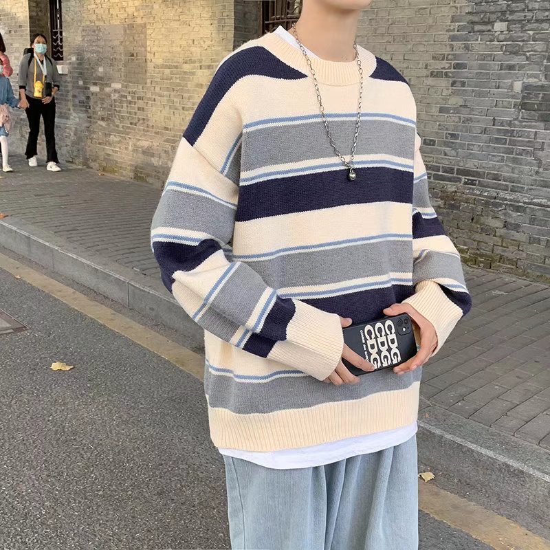 韓版圓領條紋毛衣 寬松加厚針織衫 BF風套頭毛線上衣 學院風休閑針織外衣 秋冬衣著 毛衣男(TFMY49)【壹號站】