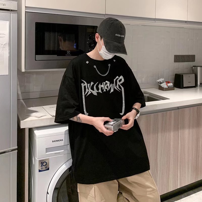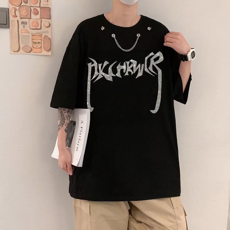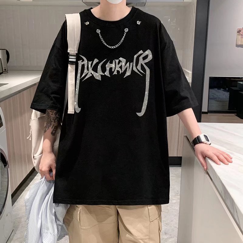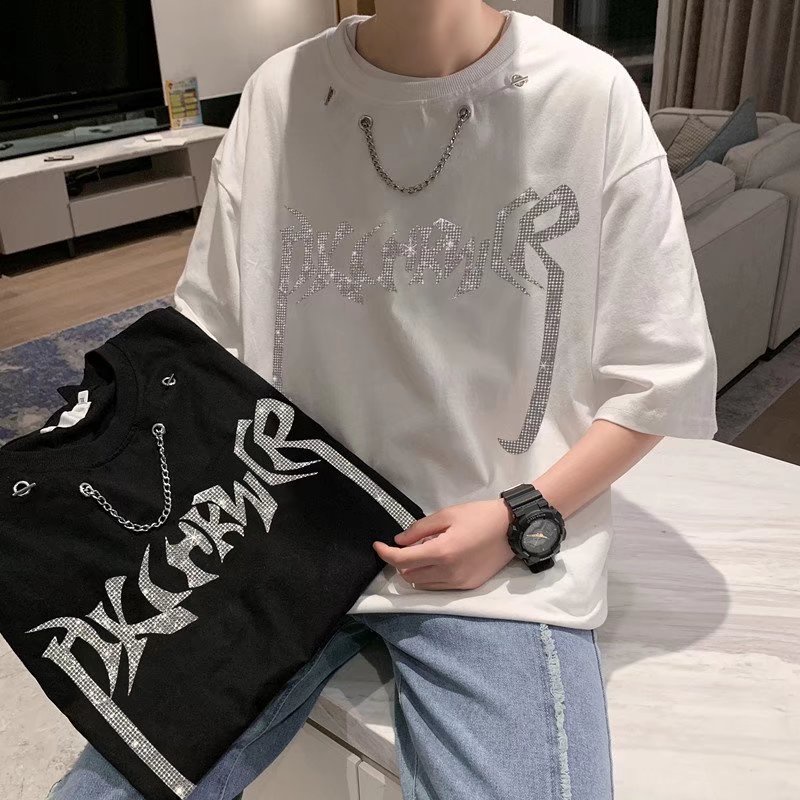 嘻哈項鏈燙鑽短T 個性設計t恤 潮流 日系 短袖T恤 男生 寬鬆 嘻哈 大尺碼 情侶 五分袖 短T(CBY40)