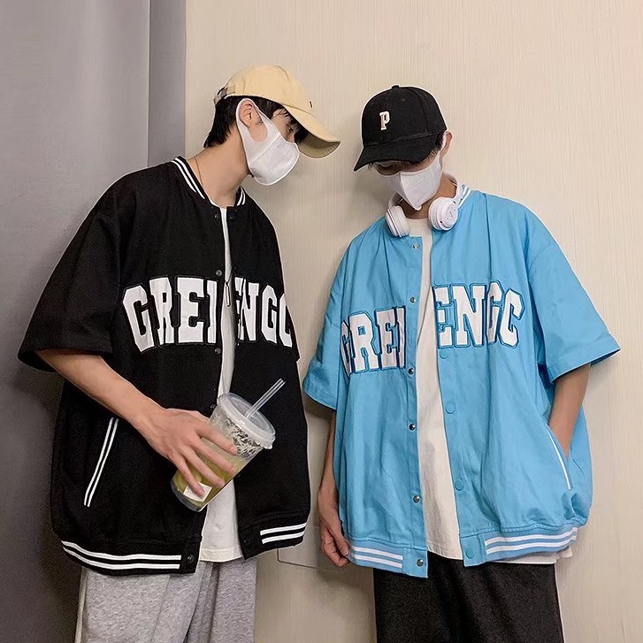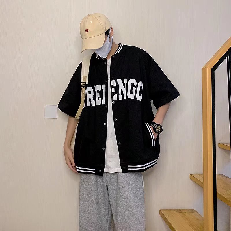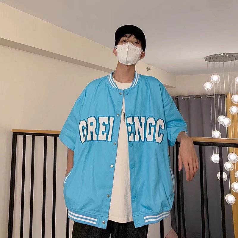 韓版棒球短袖外套 英文字 港風男外套 韓版防風情侶外套 教練夾克 帥氣潮牌短袖襯衫 男生撞色外套(SX642)