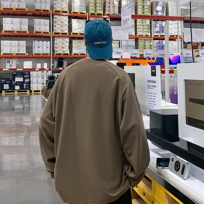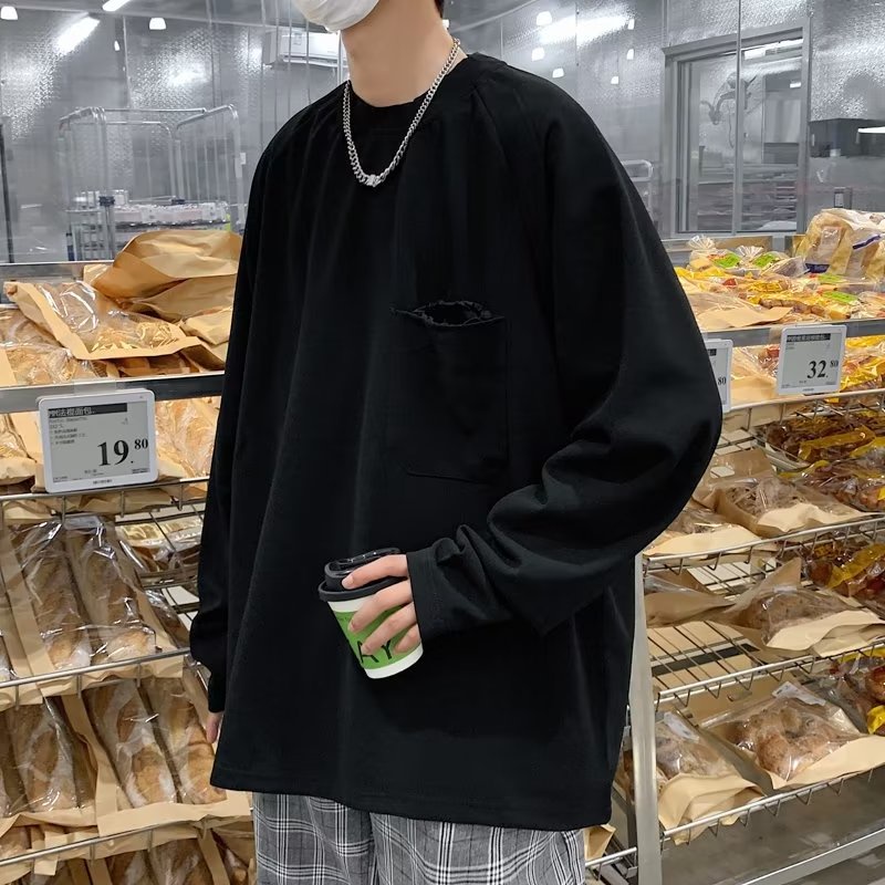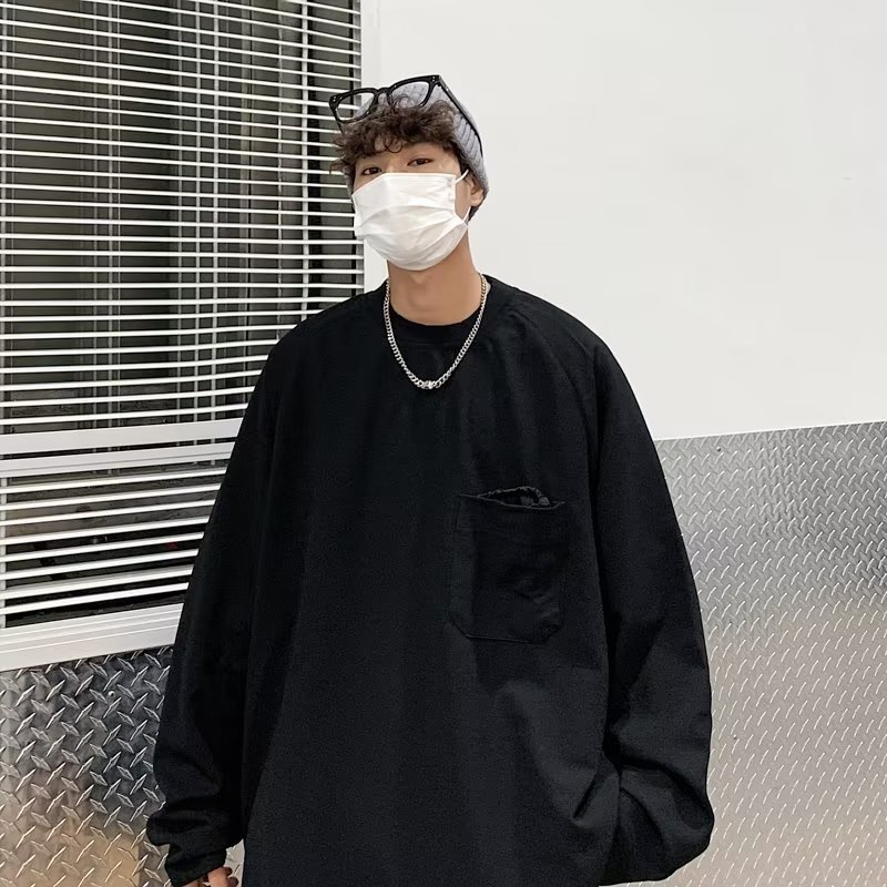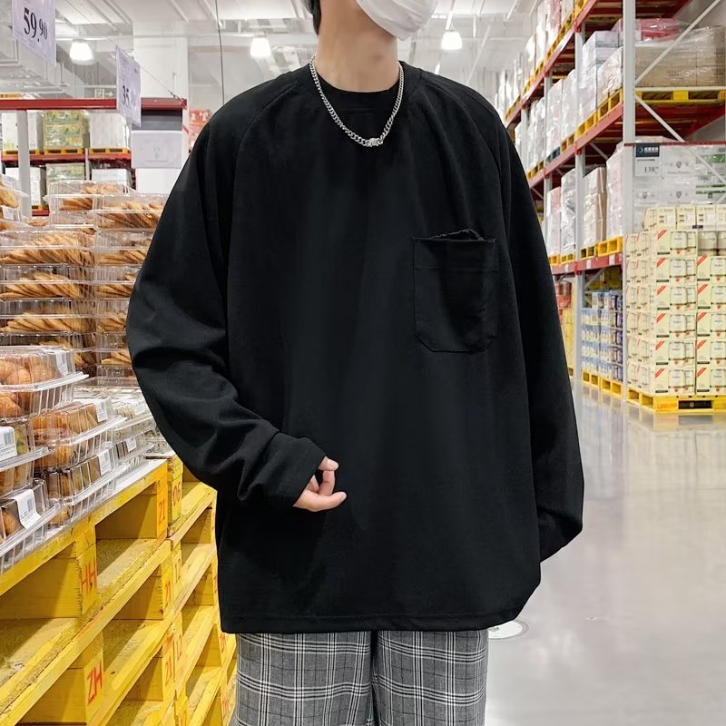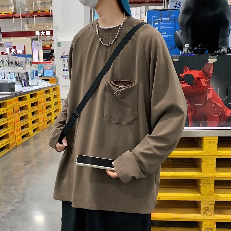 秋季韓版簡約口袋男士長袖t恤 新款韓版潮流寬松素色上衣 潮牌秋裝打底衫 大學T 衣服男(GMT85)【壹號站】
