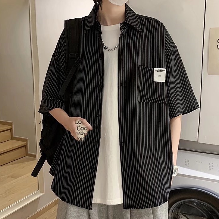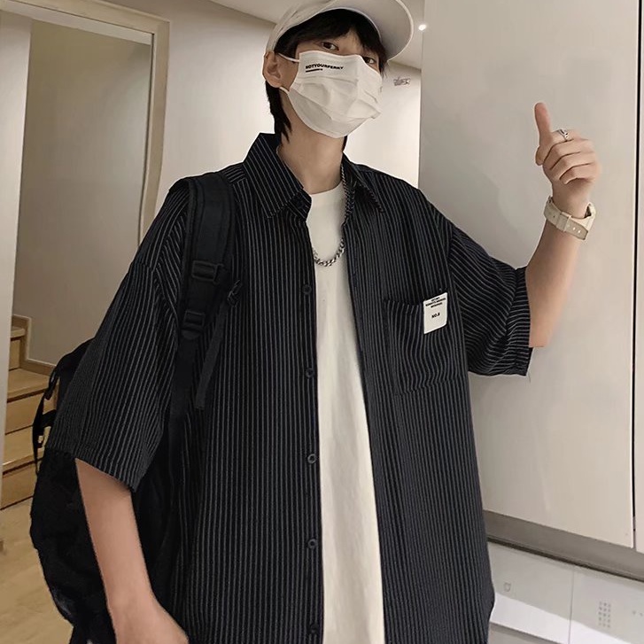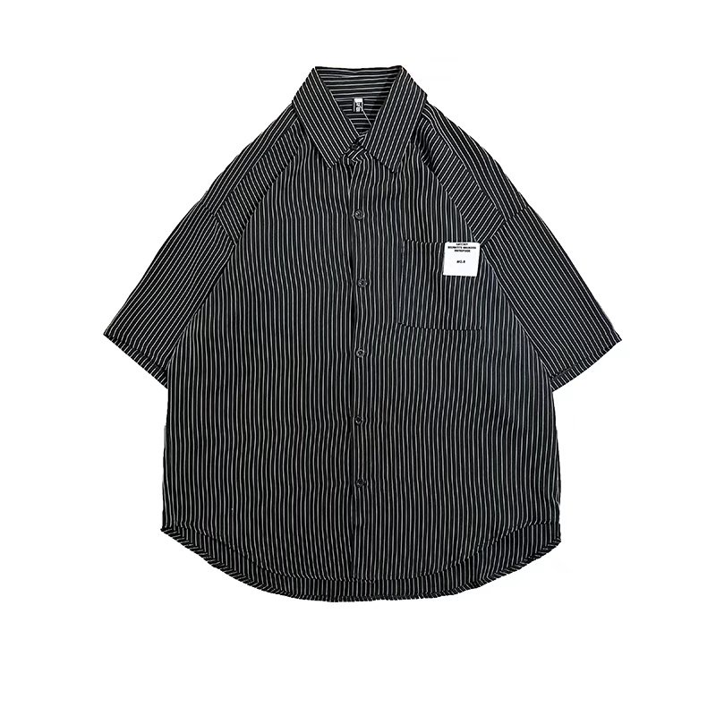 美式復古條紋短袖襯衫 男潮牌寬鬆上衣 夏季百搭休閒短袖襯衣男外套 襯衫男 條紋襯衫 短袖襯衫(DDC8803)【壹號站】