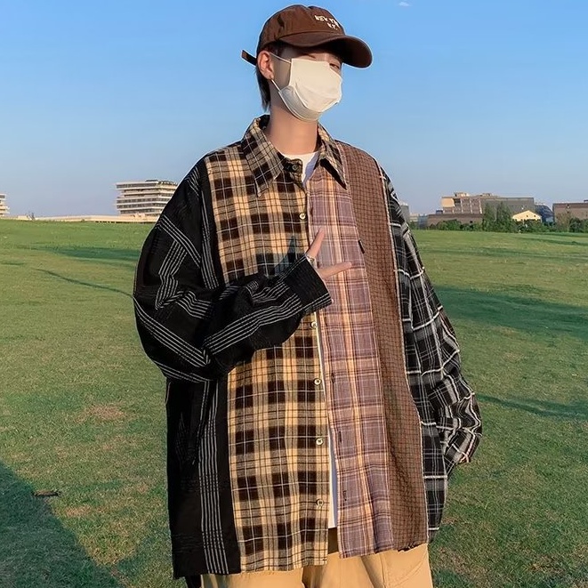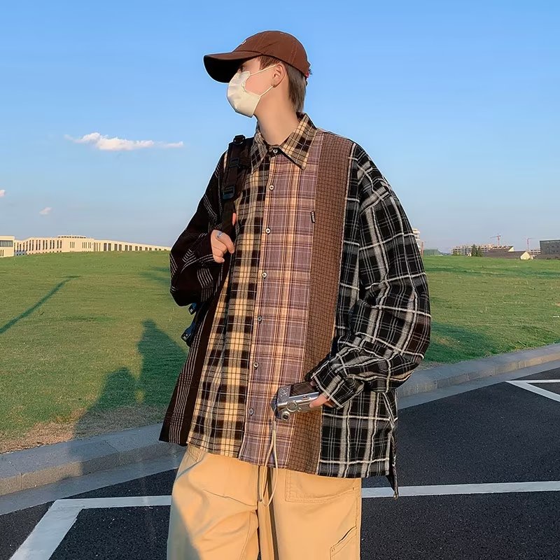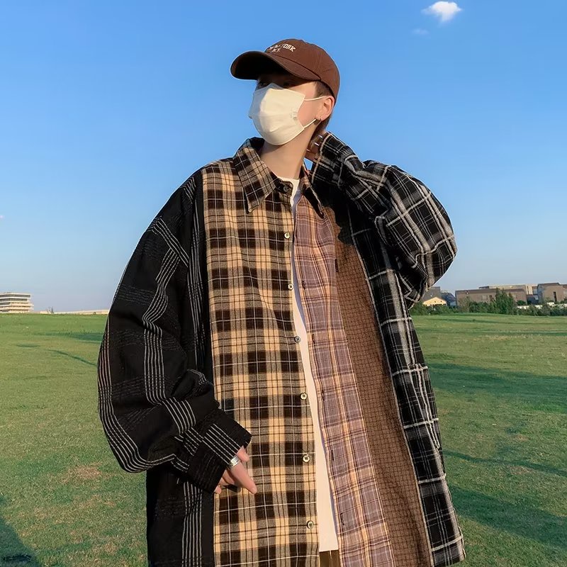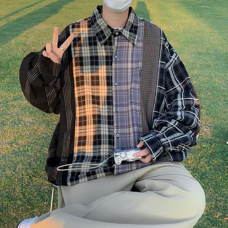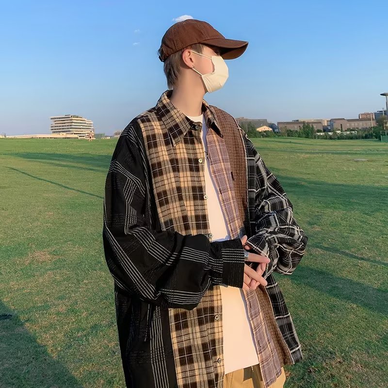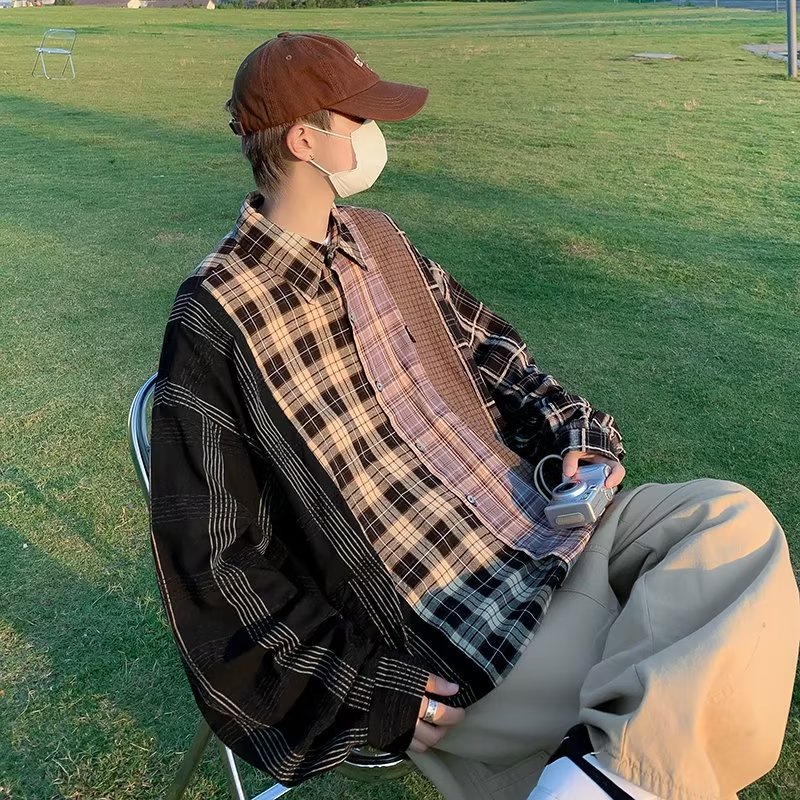 韓版拼接格紋長袖格子襯衫 秋季寬鬆襯衫 學院風襯衣長袖衣服 正韓襯衫復古英倫風襯衣 男生防曬薄衫(TNS31)【壹號站】