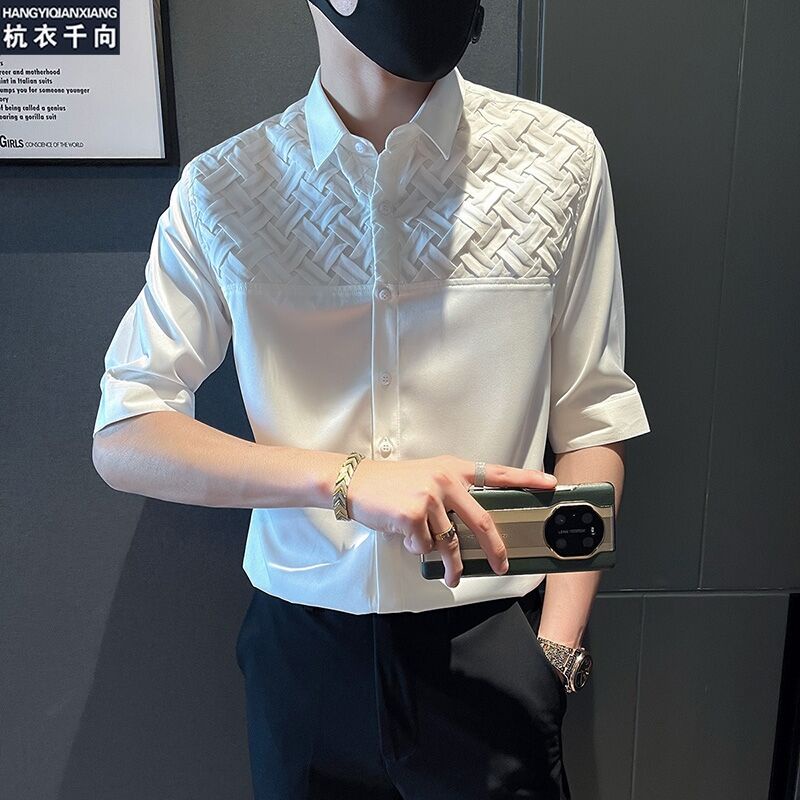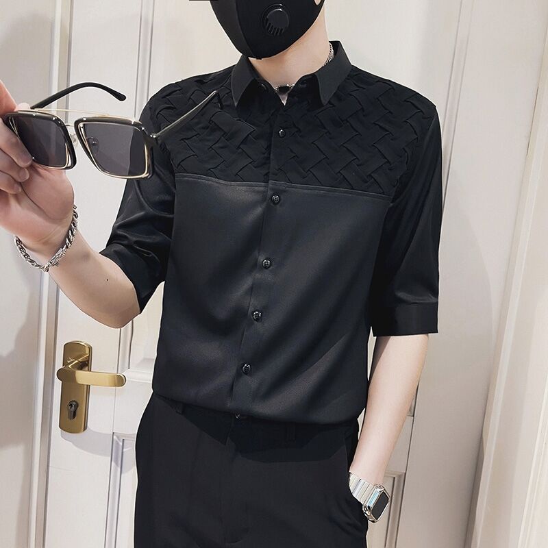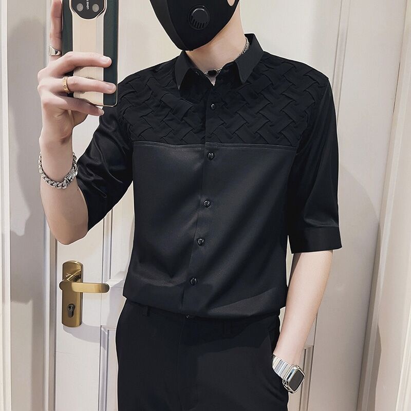 拼接格5分袖襯衫 夏季港風襯衫短袖 男士休閒修身襯衣 痞帥襯衫 百搭 薄款襯衫 男生衣著(PDJ15)【壹號站】