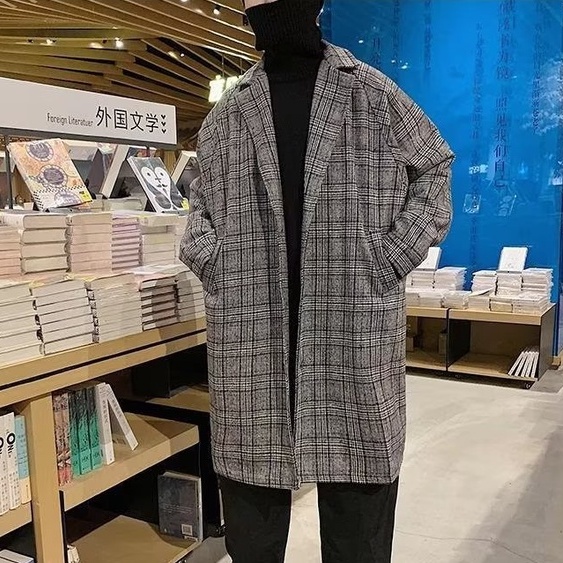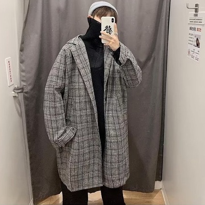 韓版新款毛呢格子外套 男潮流呢子港風中長款格子風衣男裝毛呢大衣 外套男(YJK42)【壹號站】