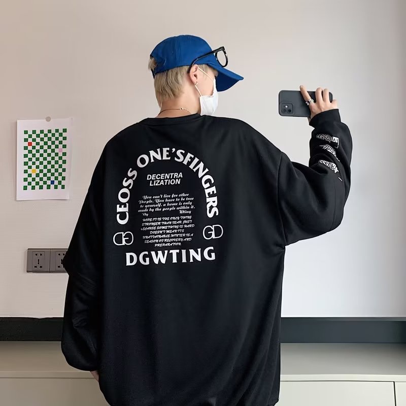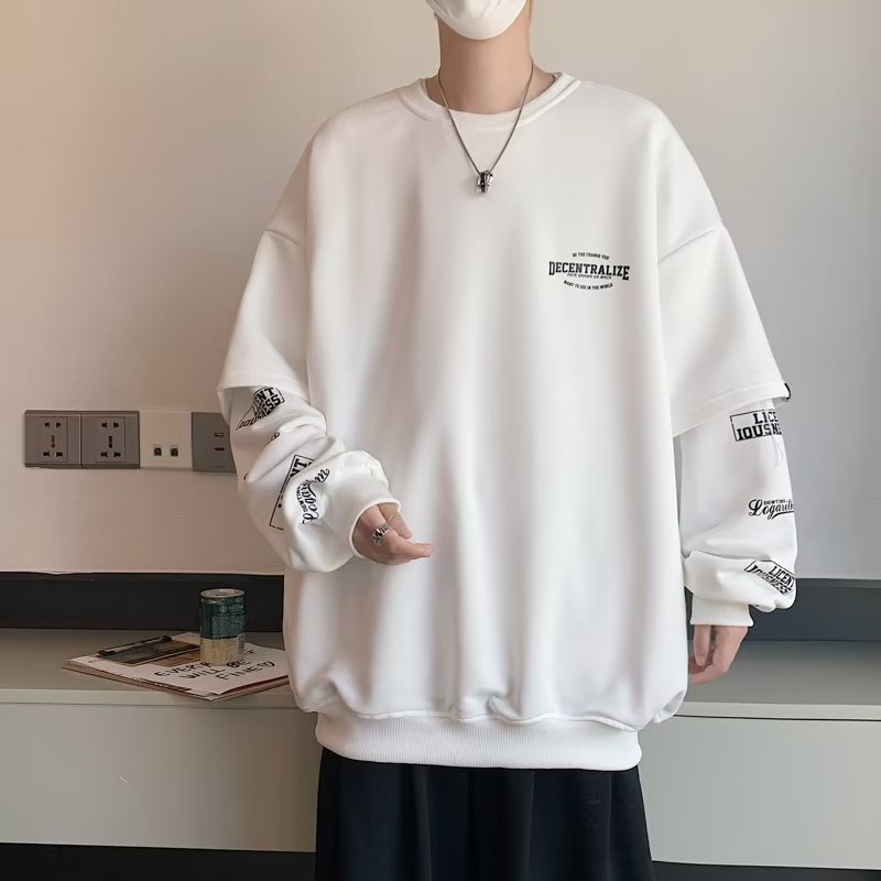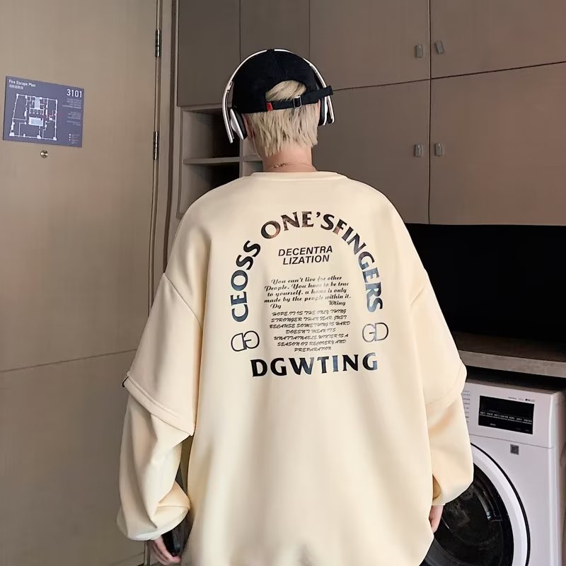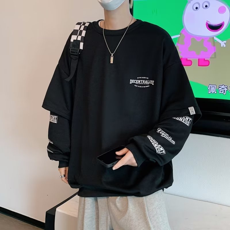 新款秋季圓領衛衣男生假兩件印花港風ins寬鬆長袖大學T 拼接格子上衣 圓領套頭印花T 長T(YWY001)【壹號站】