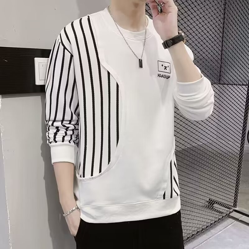 (薄款 加絨可選)韓版圓領衛衣印花大學t 男薄款青少年長袖t恤打底衫潮流寬鬆拼接條紋上衣 長T男(LR431)【壹號站】
