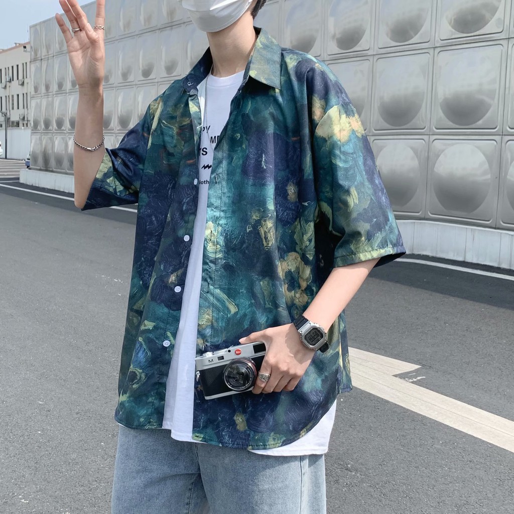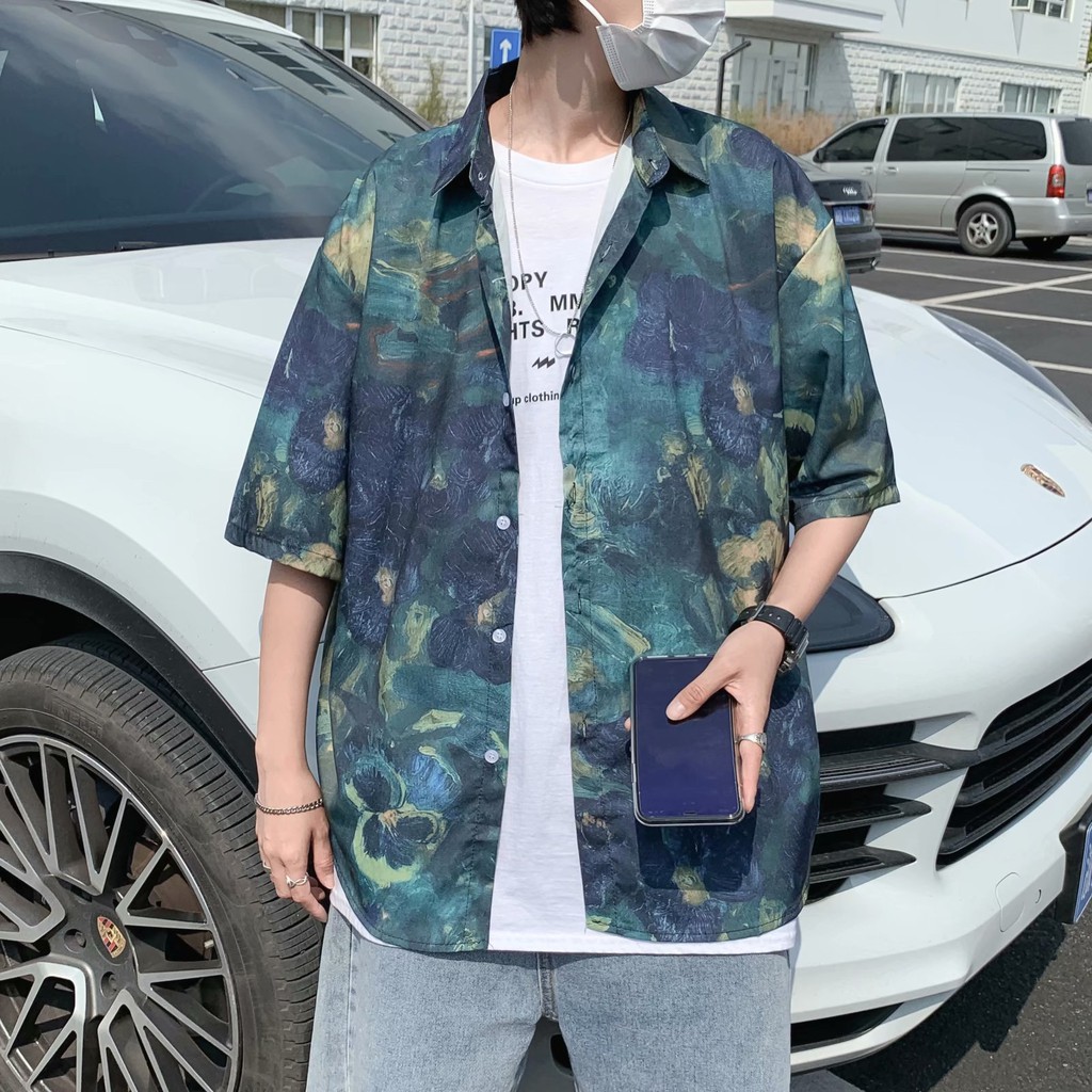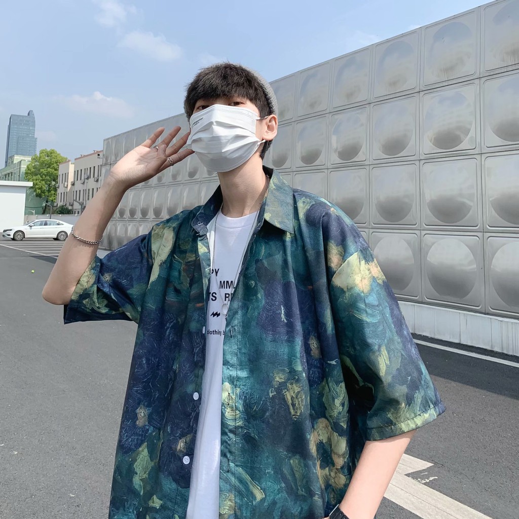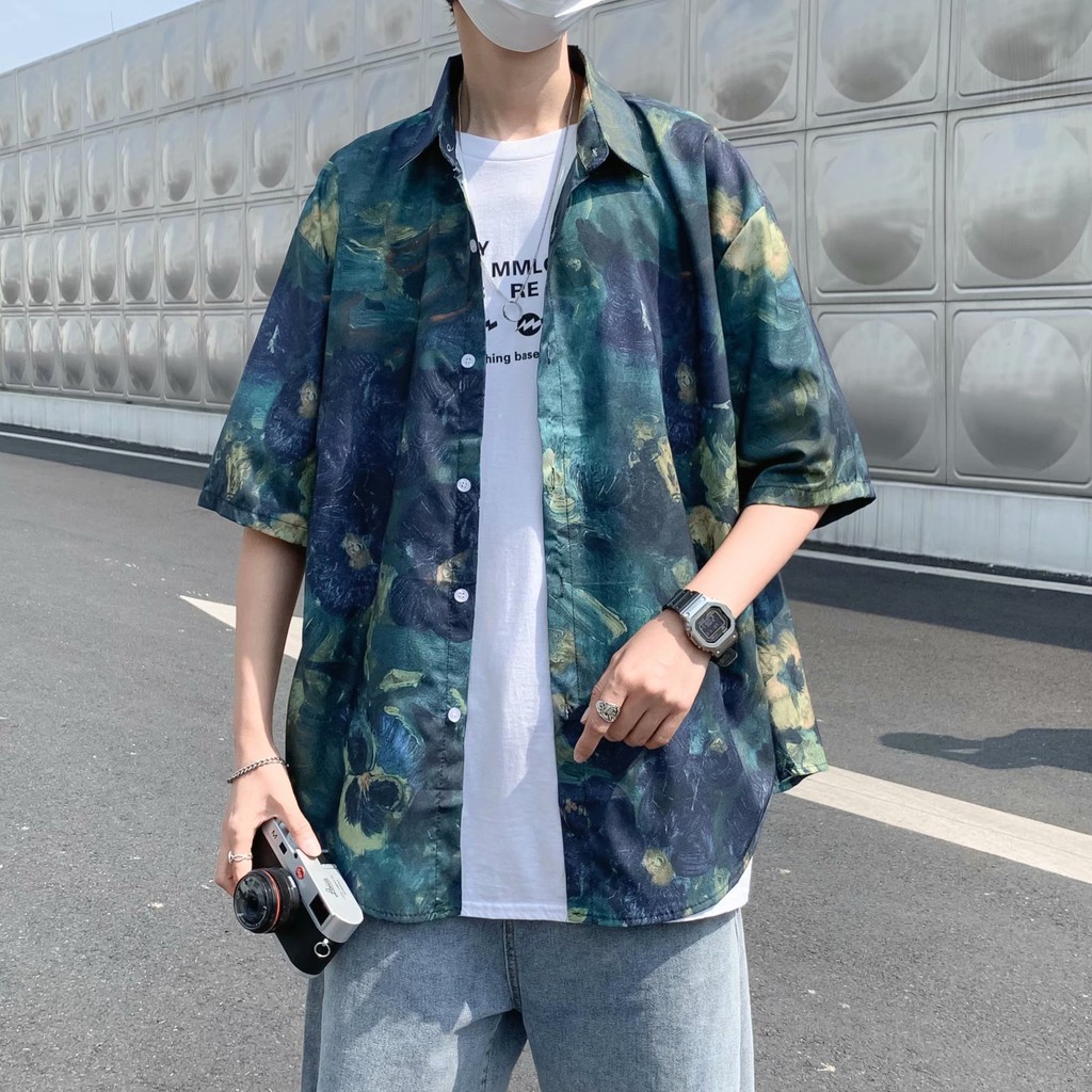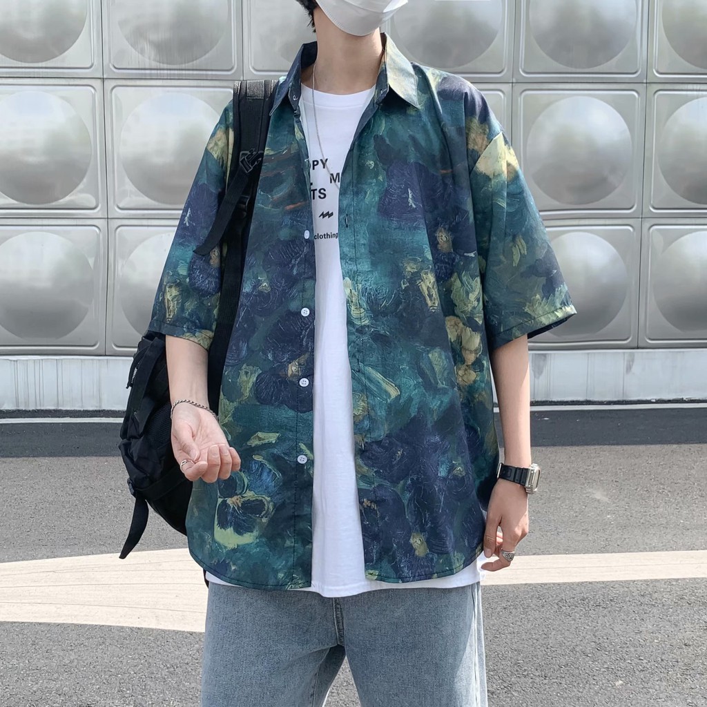 實拍扎染滿版5分袖襯衫 不規則 休閒襯衫 滿版 花襯衫 百搭 日式 寬鬆襯衫 情侶襯衫 短袖襯衫(XX323)