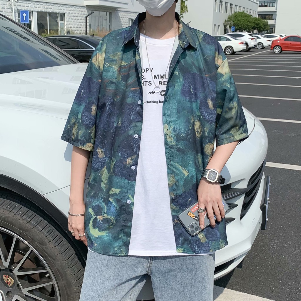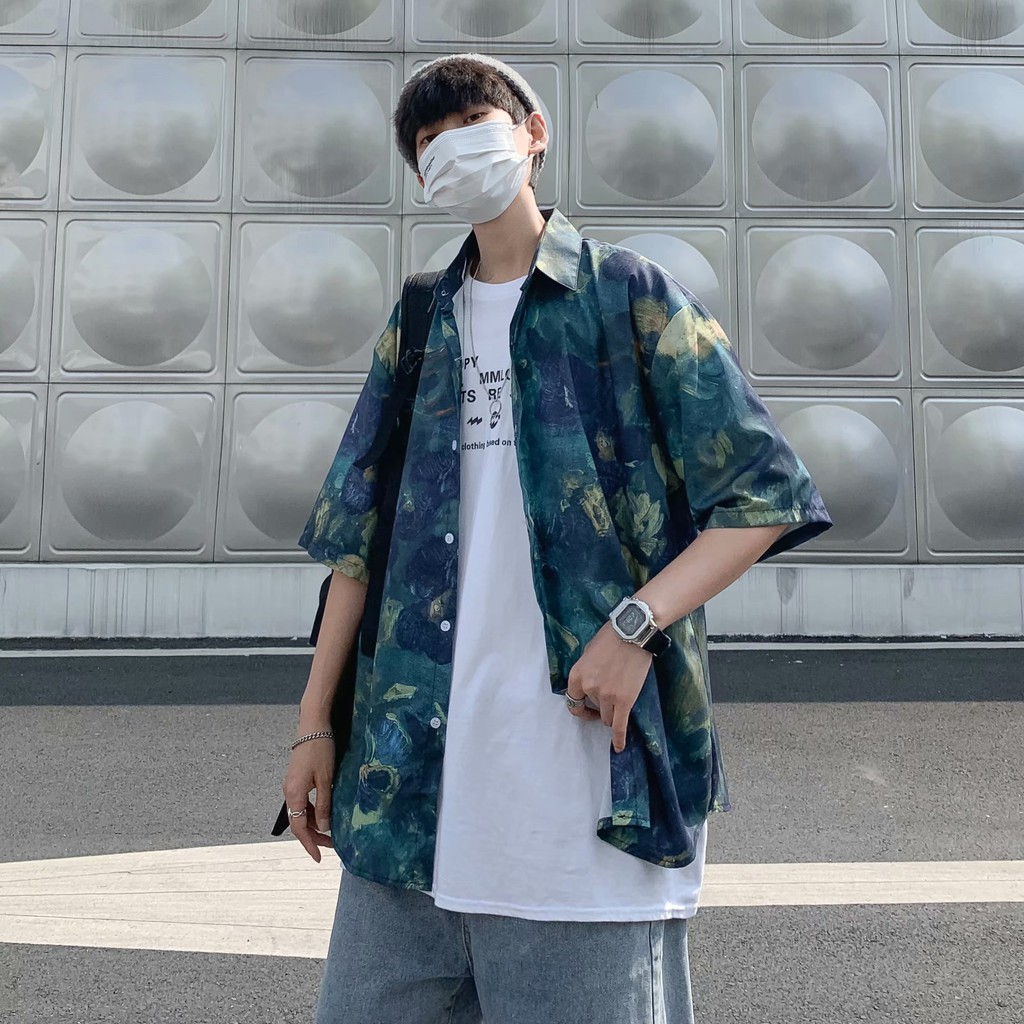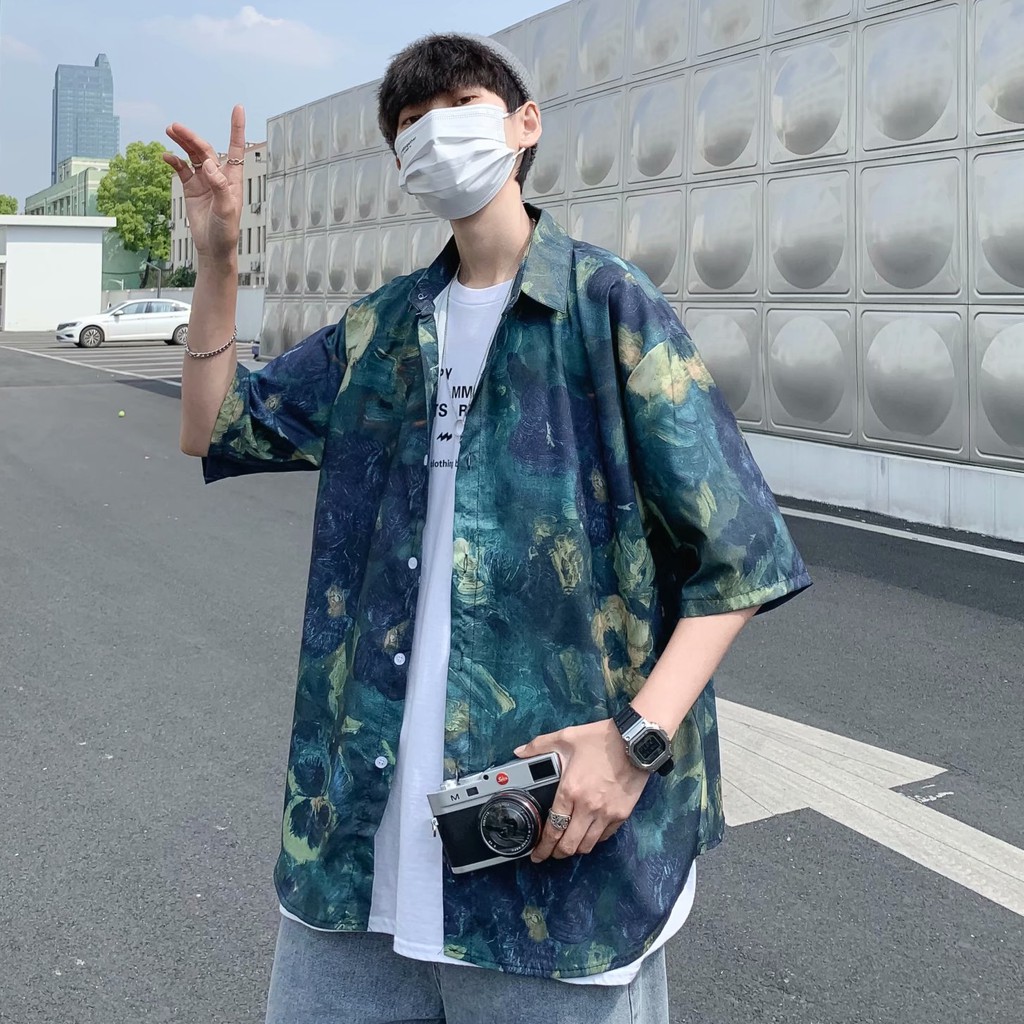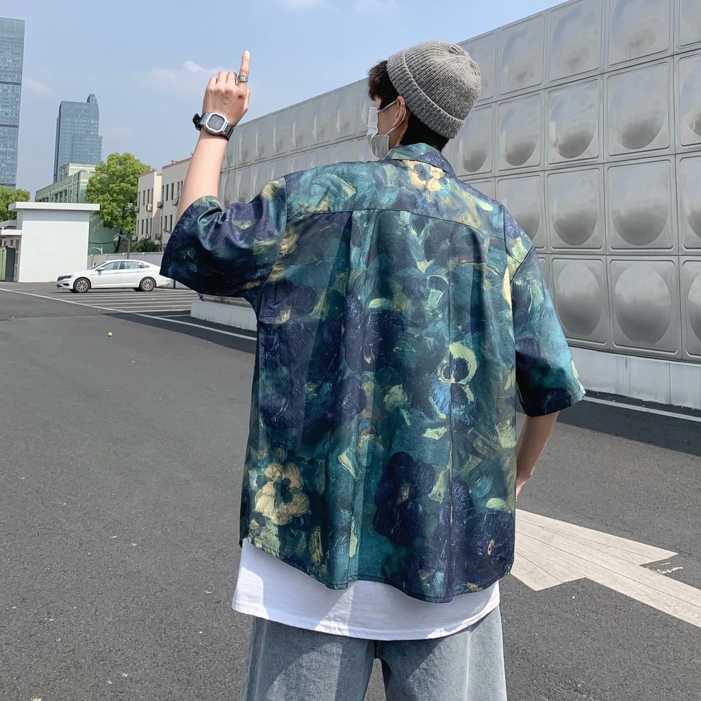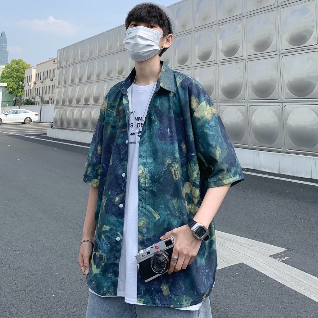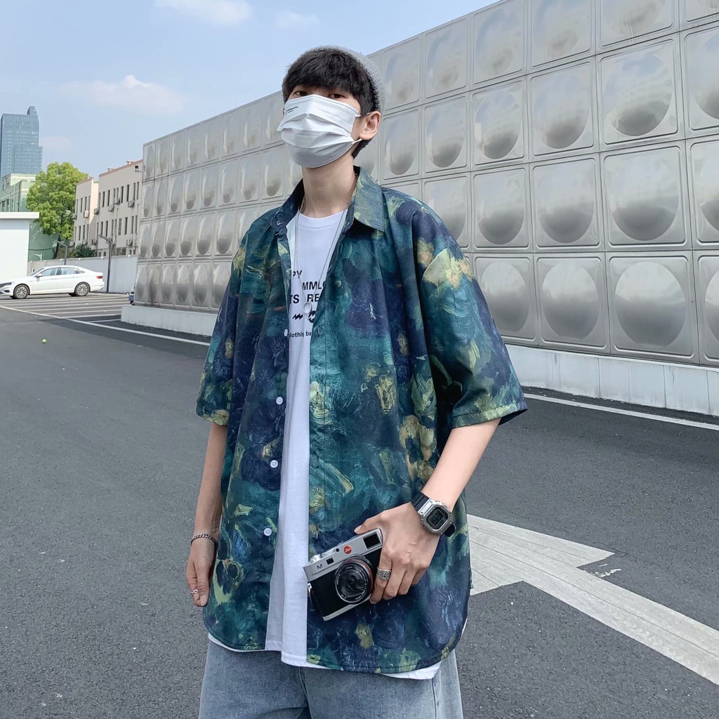 實拍扎染滿版5分袖襯衫 不規則 休閒襯衫 滿版 花襯衫 百搭 日式 寬鬆襯衫 情侶襯衫 短袖襯衫(XX323)