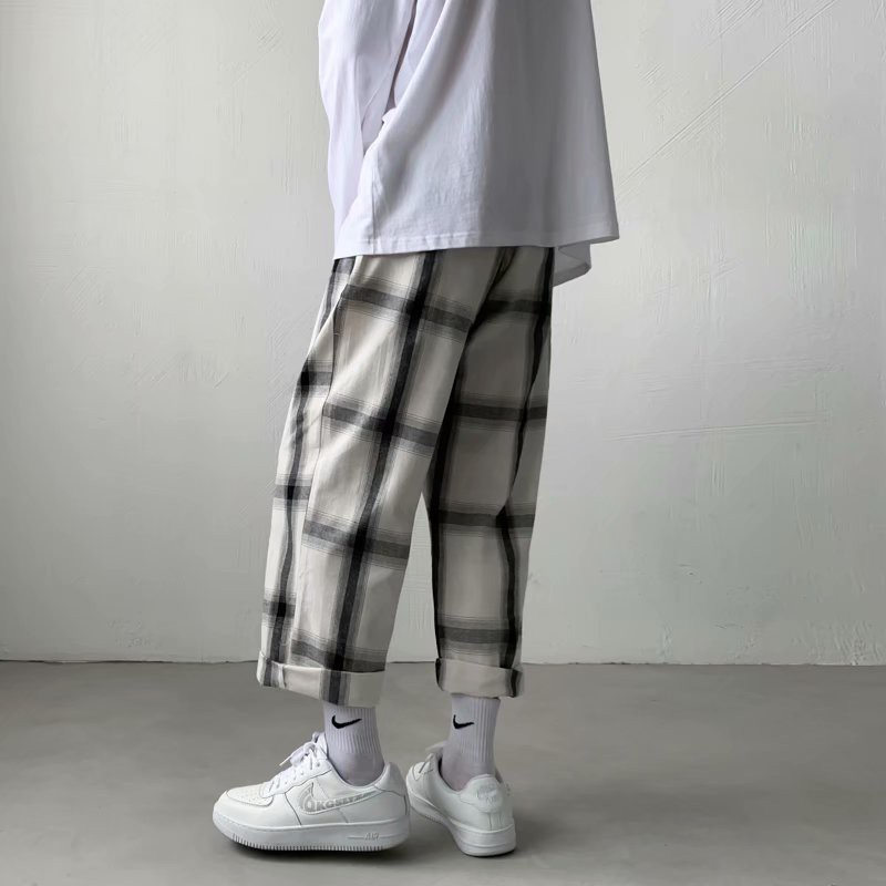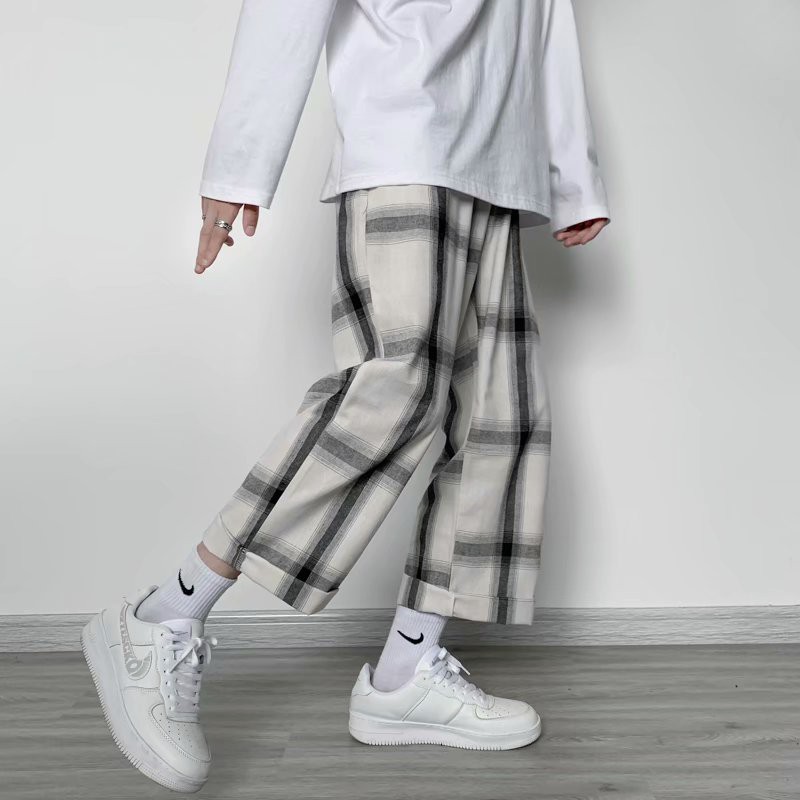 格子褲 男士褲子小碼黑白格青年休閒褲男生褲格子九分褲寬鬆褲 格紋褲(QBK14)【壹號站】