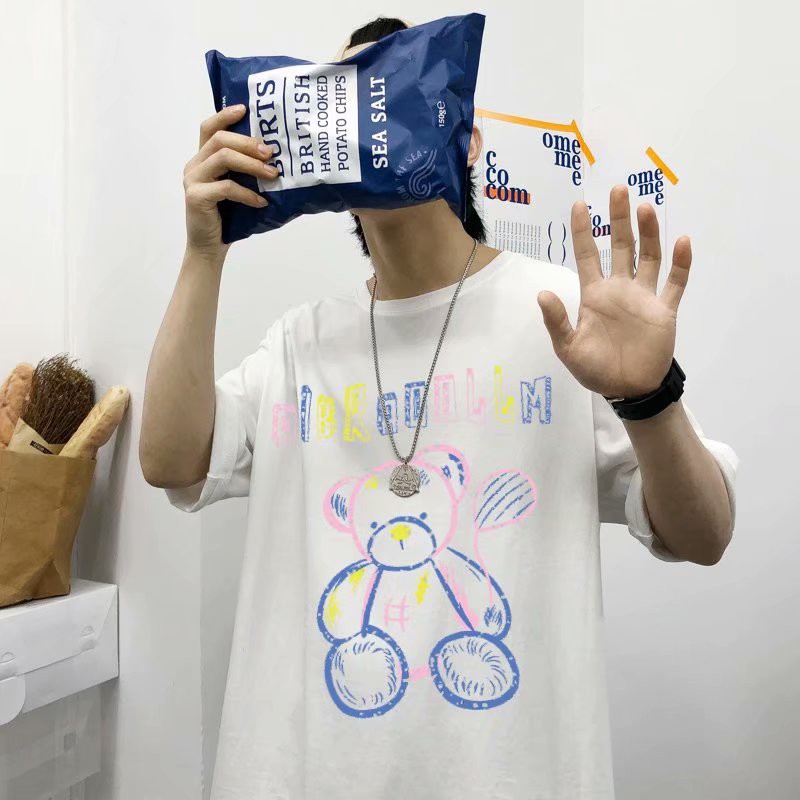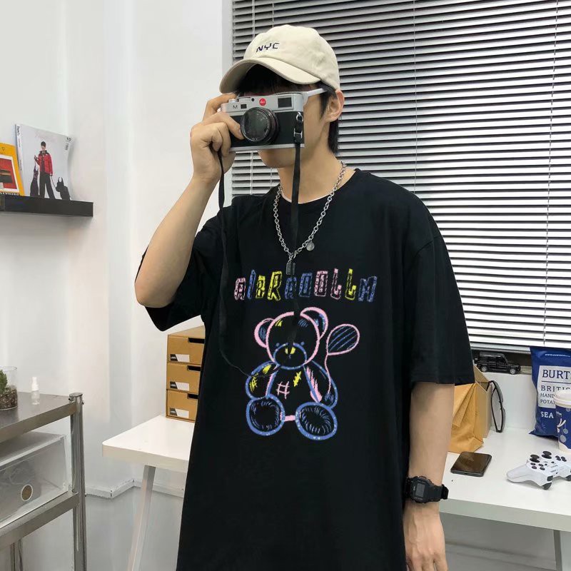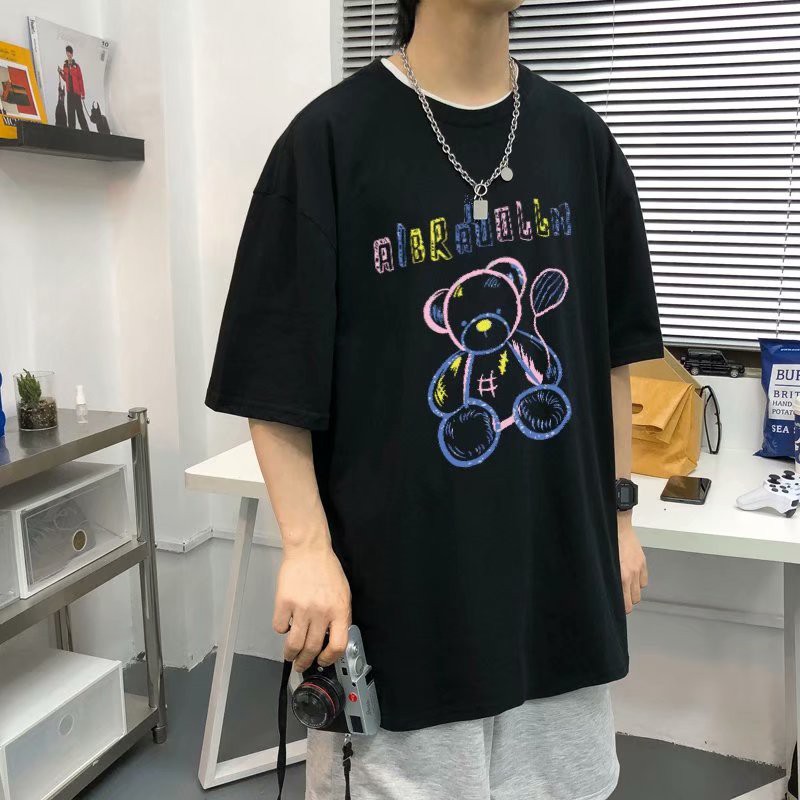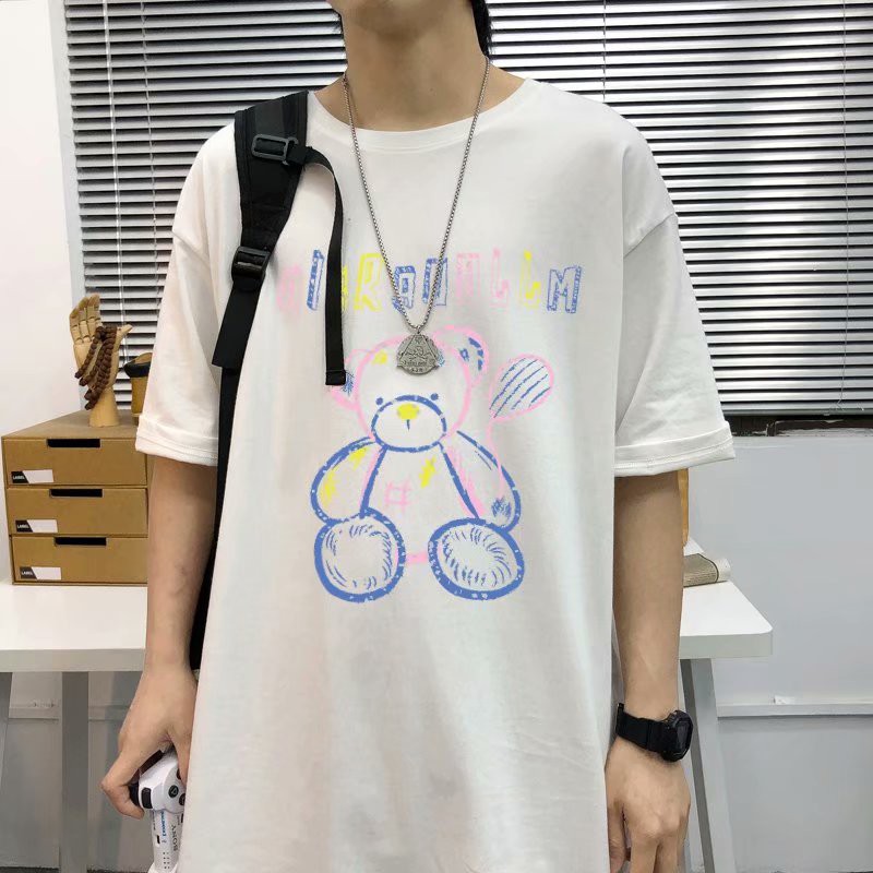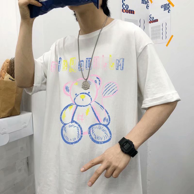 港风彩色小熊印花短T 男高初中生圆领套头衫宽鬆 印花T 短袖上衣 大學T 短T T恤(SKS540)【壹號站】
