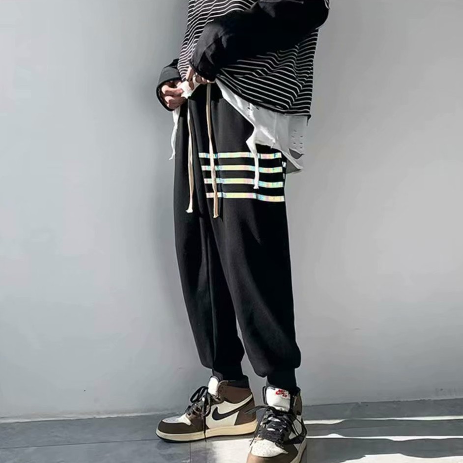 反光四槓潮褲 男士 寬鬆 束腳 休閒長褲 薄款 潮牌 九分針織潮流褲子 (LP001)【壹號站】
