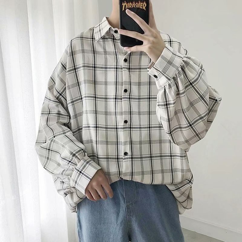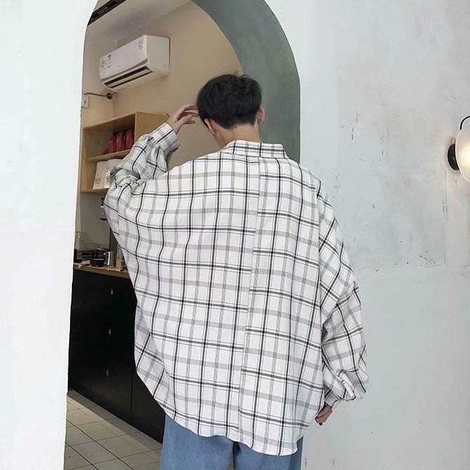 格子寬鬆襯衫男 韓版 潮流 寬鬆 襯衣服長袖 港風學生帥氣百搭防曬外套(VKZK31)【壹號站】