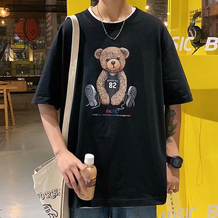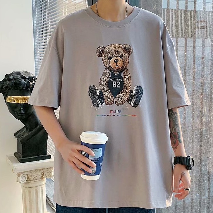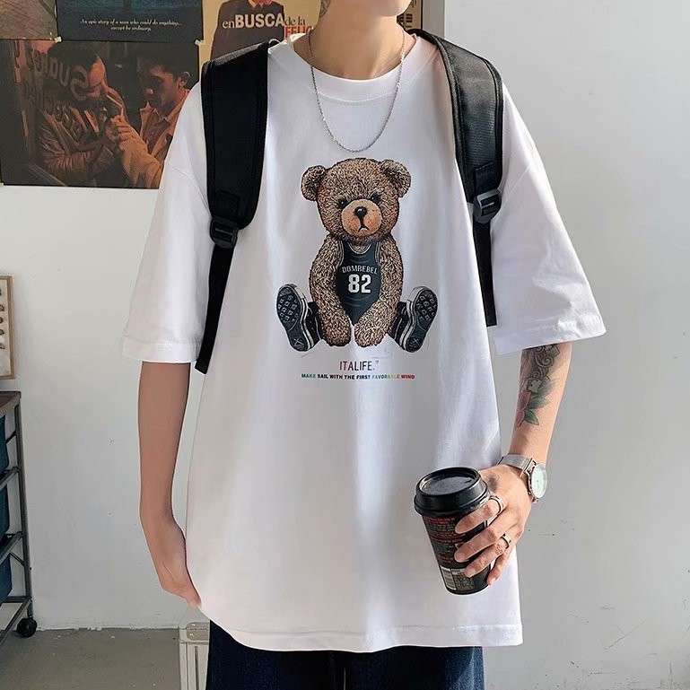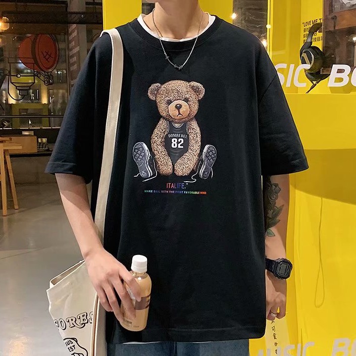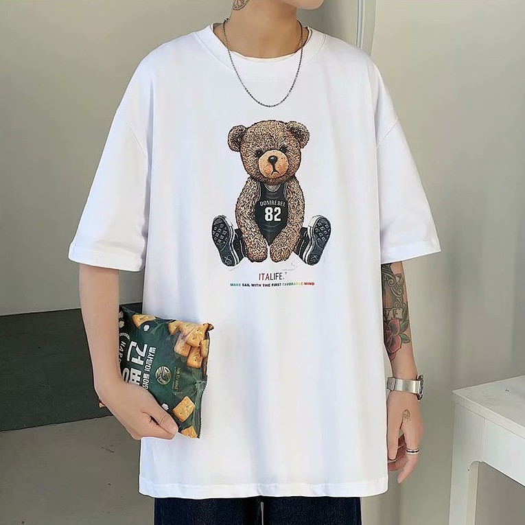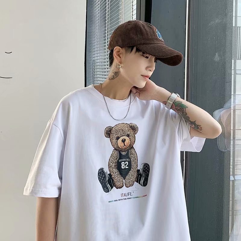 短袖t恤2021新品港風潮流休閒寬鬆百搭半袖上衣帥氣潮牌小熊體恤衫男士韓版潮流寬鬆百搭五分袖(LR982)