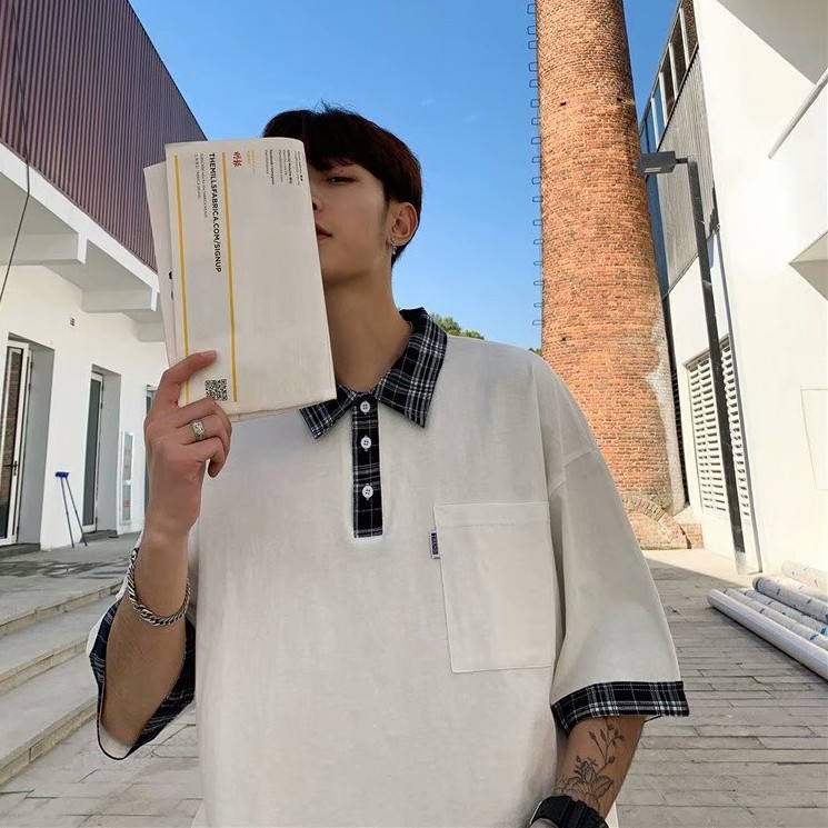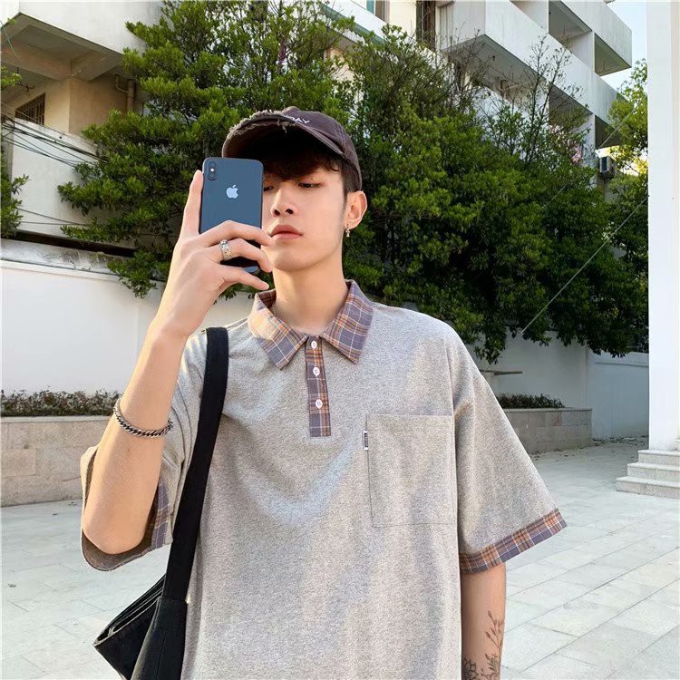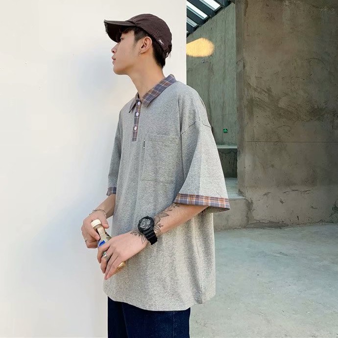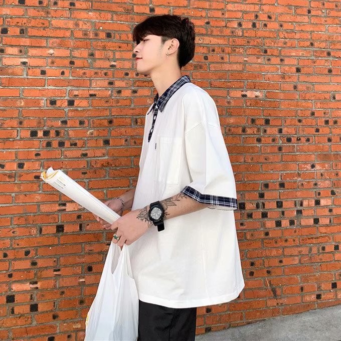 格子翻領 寬鬆短袖上衣假兩件 男生POLO衫T恤韓版潮流男裝寬鬆短袖上衣假兩件素t男生T恤短t(CBT324)【壹號站】