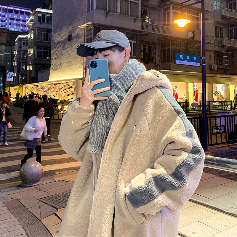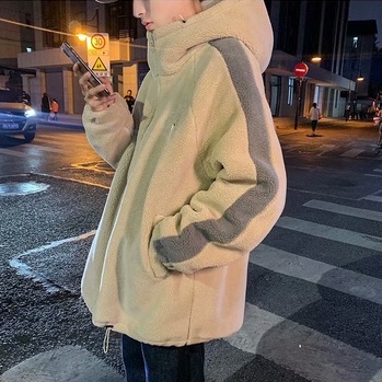 潮牌羊羔毛拼接外套男 帽衫外套男 韓版寬鬆上衣服 休閒百搭開衫外套 原宿風潮流情侶外套 百搭帽衫(TFY43)【壹號站】