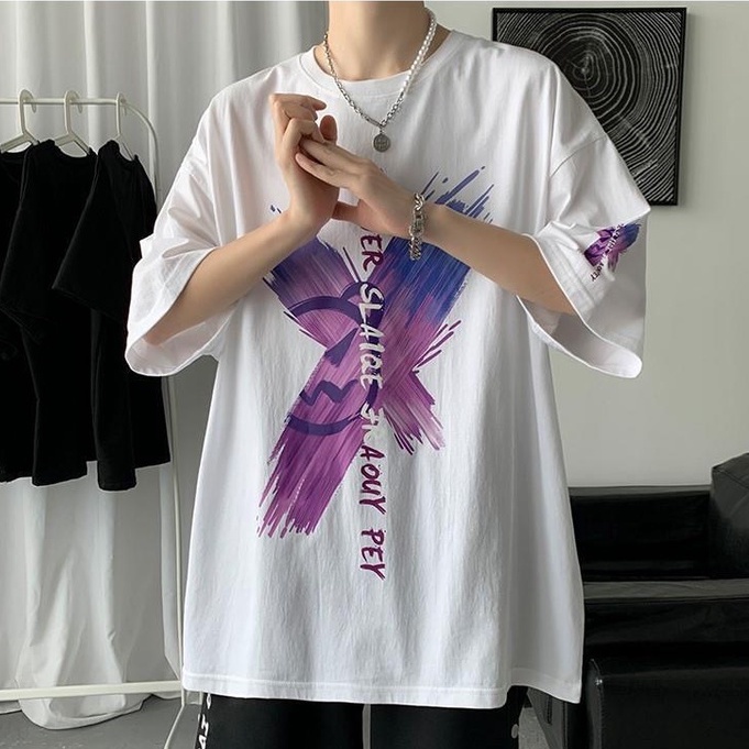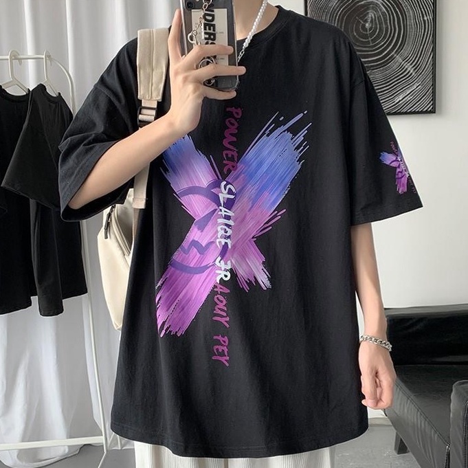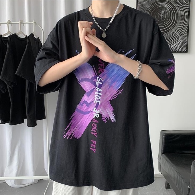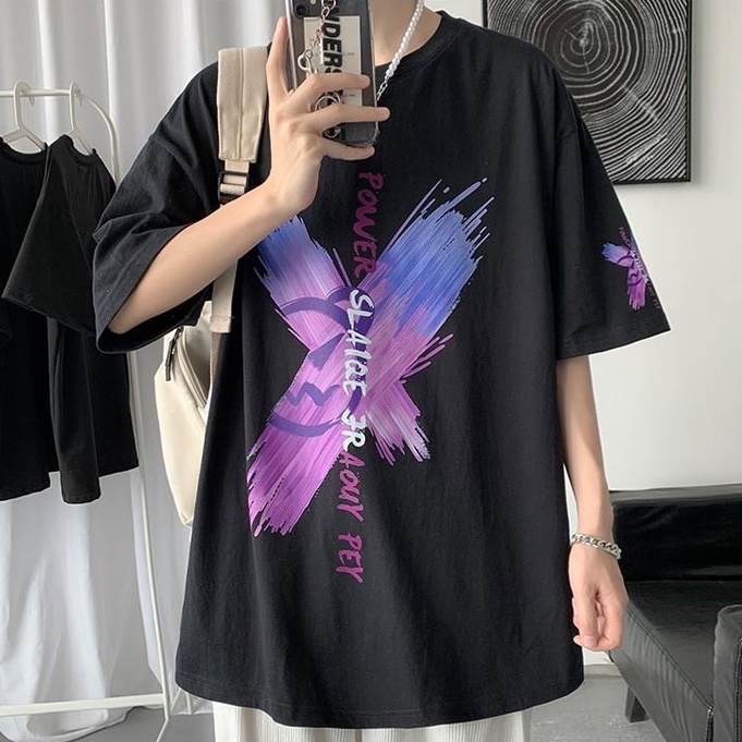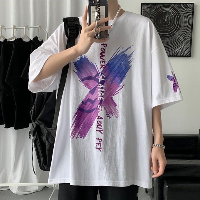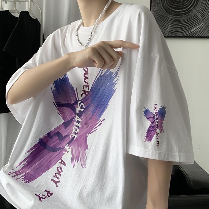 港風印花夏季衣服 素t 潮流 日系 短袖T恤 男生 寬鬆 嘻哈 大尺碼 情侶 五分袖 男t 短T(SKS400)