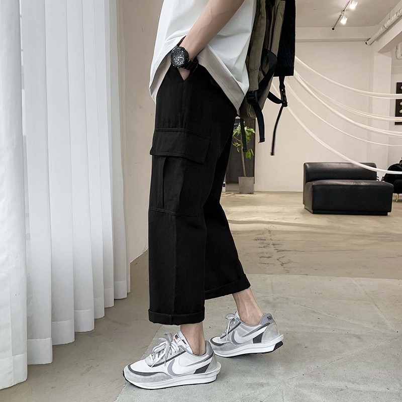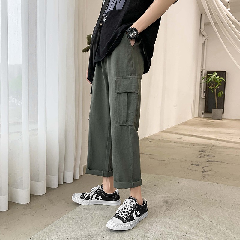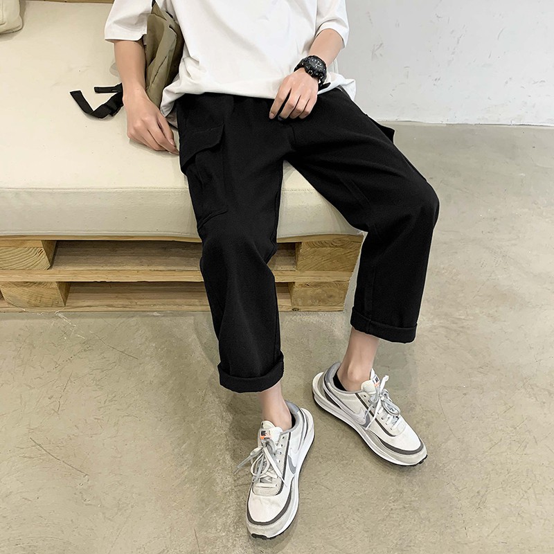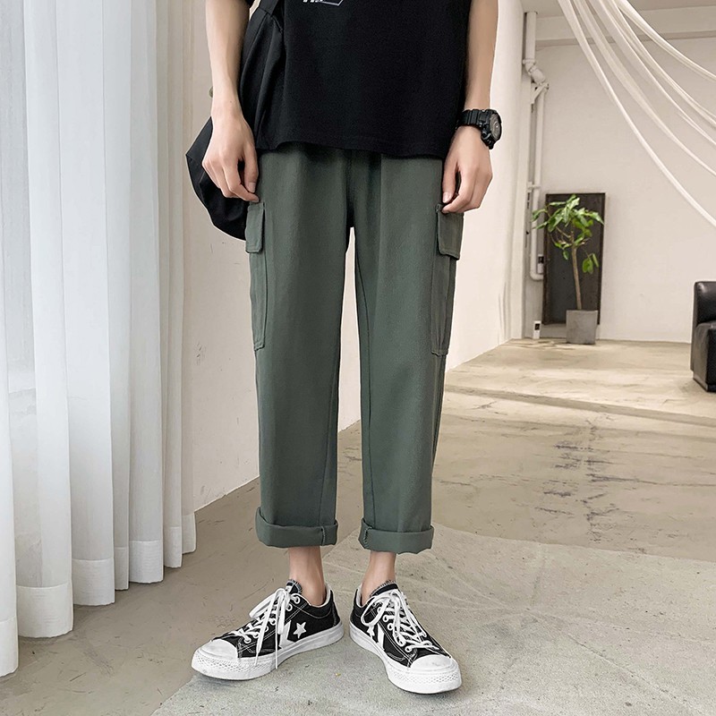 韓版松緊腰薄款工裝褲(S-3XL)9分褲子男款寬鬆工裝褲男士素面哈倫九分褲潮 工裝長褲(LKK27)【壹號站】