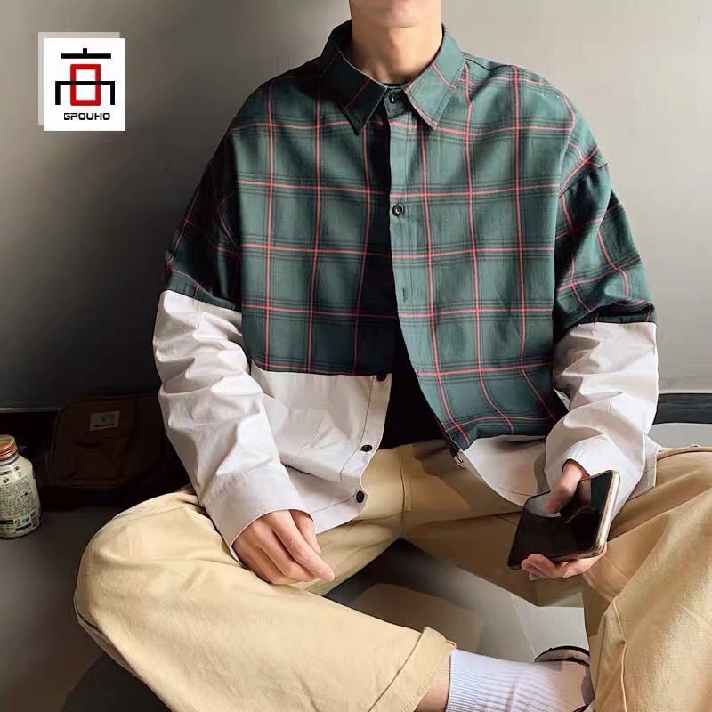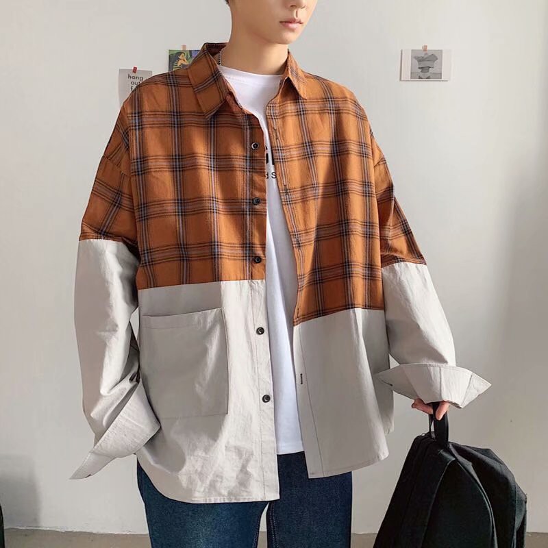 秋季日系格子拼接襯衫男加肥大碼潮流百搭胖子寬鬆休閑長袖襯衣服(RSJ708)【壹號站】