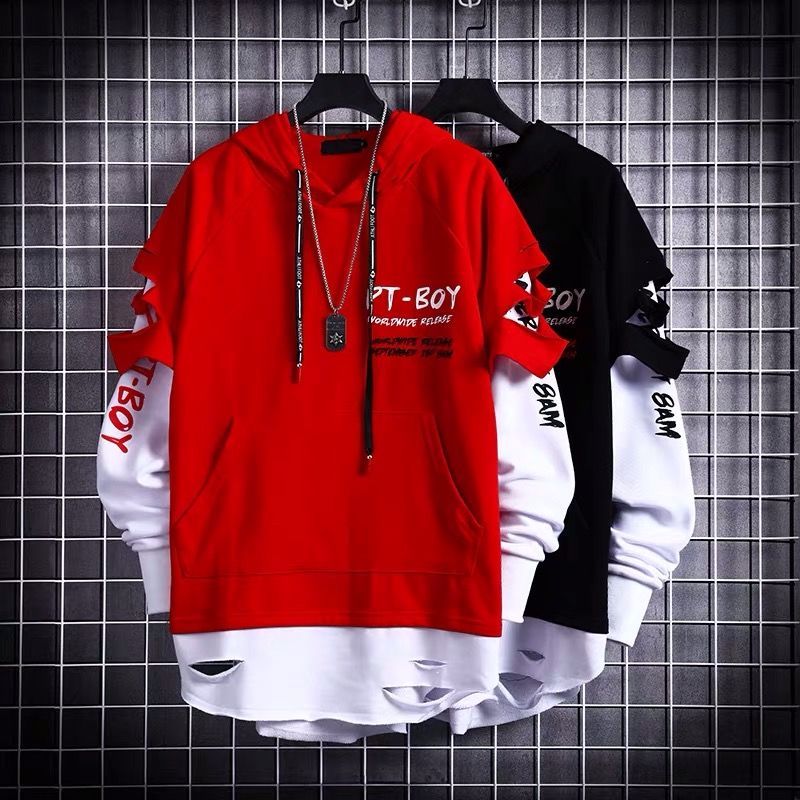 嘻哈衛衣T恤 潮牌寬鬆男學生韓版潮流ins上衣破洞假兩件長袖T恤大學T(XM007)【壹號站】