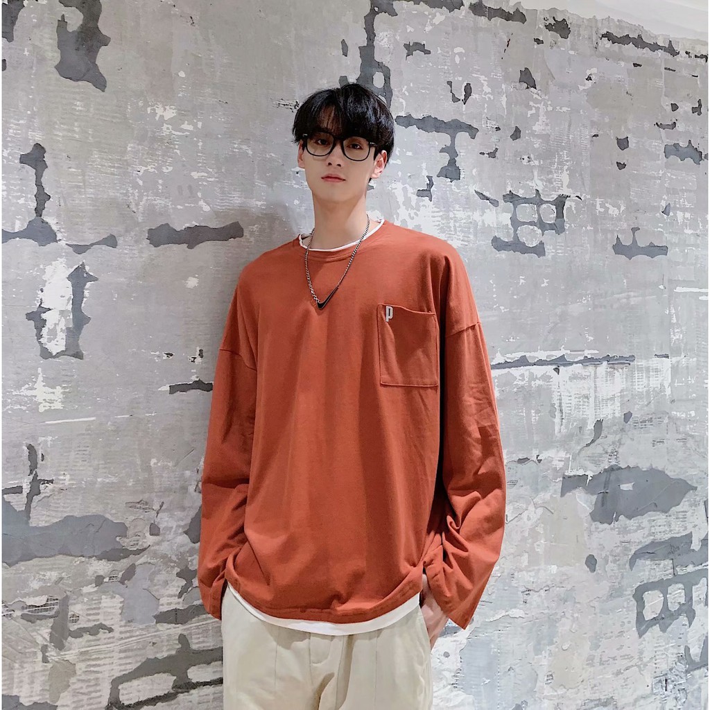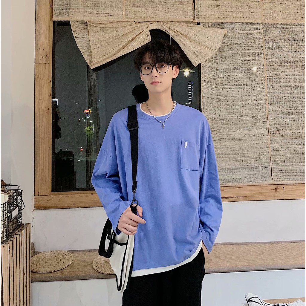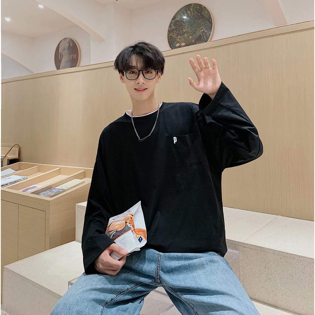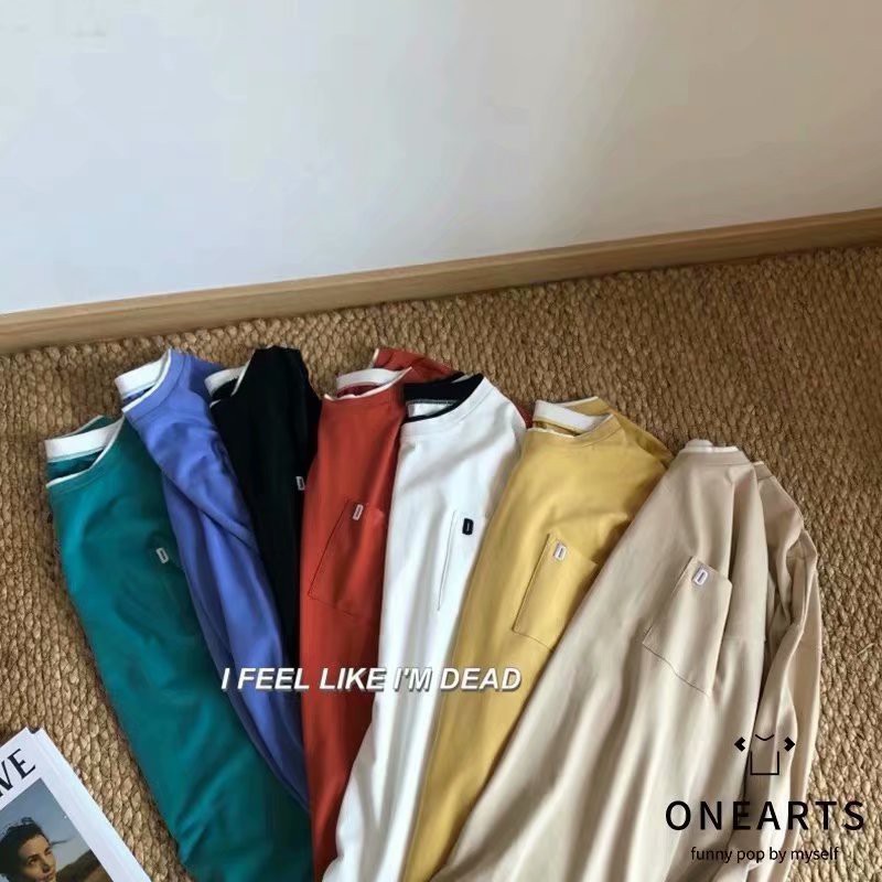 假兩件寬鬆口袋長袖T恤 大學T 多層次穿搭落肩T 情侶款 口袋繡花 素面 素面大學T (CBT12)【壹號站】