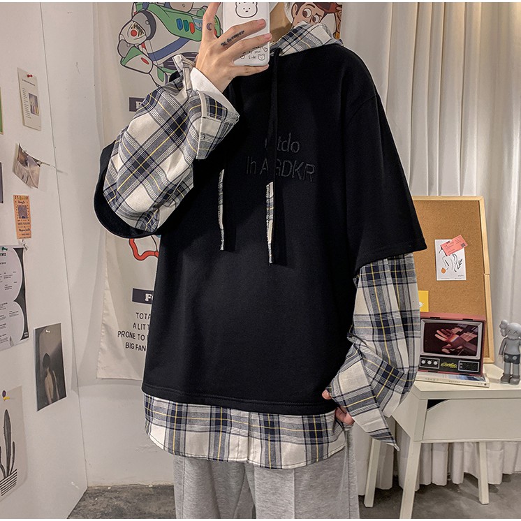 假兩件格子拼接薄款衛衣男潮港風襯衫領寬松長袖上衣套頭秋季男生情侶 大學T 連帽上衣(CEZ6088)【壹號站】